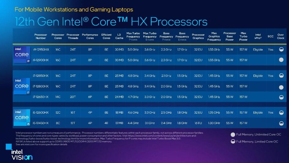 Cała rodzina Intel Alder Lake HX składa się z łącznie siedmiu procesorów Core, różniących się zarówno zestawem rdzeni, osiąganym taktowaniem, możliwością podkręcania i ewentualną kompatybilnością z platformami vPro poprzez obsługę funkcji ECC, czyli korekcji błędów pamięci. Poza tym pozostają takie same w kwestii matrycy krzemowej (H0, a nie okrojonej, jak rodzina Core -H) oraz poziomów Processor Base Power (55 watów) i Max Turbo Power (157 watów).