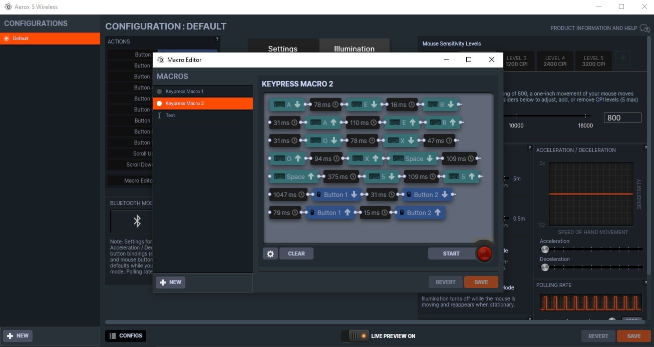 Druga zakładka obejmuje proste menu dostosowywania podświetlenia, jego ogólnej jasności oraz efektu w ramach trzech całkowicie niezależnych stref. Te można modyfikować nie tylko pod kątem barwy, ale też trybu działania spośród niestety tylko trzech – stałego koloru, oddychania na wiele barw, czy regularnego ich zmieniania. Trzecia (poniższa) dotyczy już tylko zaawansowanego kreatora makr w myśl zarówno tych tekstowych, jak i „klikających”.