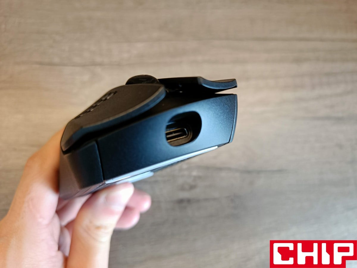Poza tym na przodzie myszki producent umieścił port USB-C do trybu przewodowego i ładowania wbudowanego akumulatora, a na spodzie trzy ślizgacze PTFE o zaokrąglonych krawędziach. Poza tym tuż nad sensorem znalazł się przełącznik trybu działania (Bluetooth, tryb przewodowy (off), radiowy 2,4 GHz) i to tak naprawdę wszystko, co warto skomentować, jeśli idzie o fizyczność tego modelu.