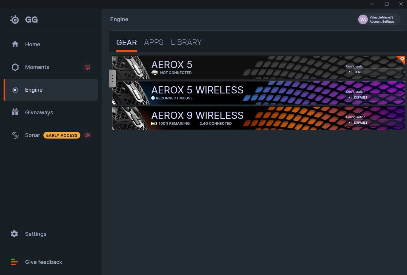 Towarzysząca Aerox 5 Wireless aplikacja SteelSeries GG pozwala zgromadzić kompatybilne sprzęty marki w jednym miejscu, a przed opcją ich dostosowania, wymusza na nas (zwykle) aktualizacje firmware. Ustawienia dedykowane modelowi sprowadzają się do trzech menu, z czego to pierwsze jest zdecydowanie najważniejsze, bo dotyczy głównych ustawień.