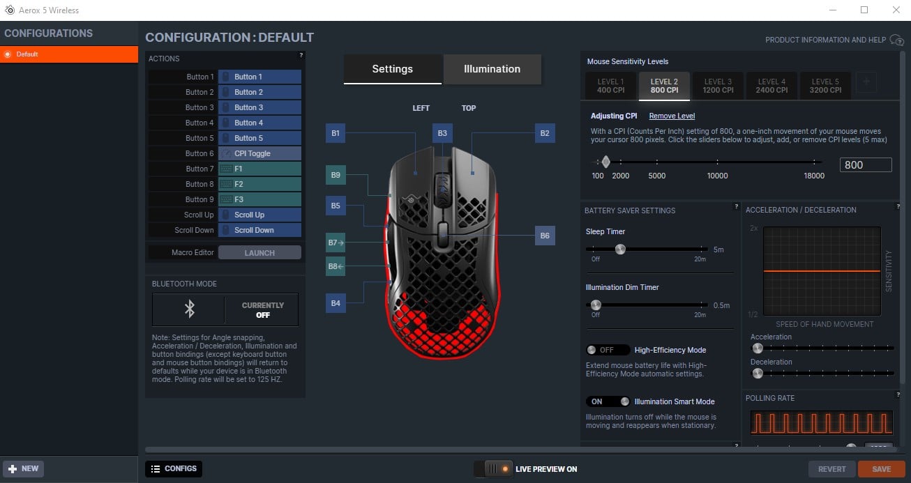 Wśród nich nie znalazły się tylko te podstawowe, czyli dostosowywania DPI na maksymalnie pięciu poziomach, ustawiania częstotliwości odświeżania na poziomie od 125 do 1000 razy na sekundę czy podmieniania funkcji przycisków. Znajdziemy tam też możliwość zmiany natężenia predykcji oraz zwiększenia i zmniejszenia prędkości w pierwszych i ostatnich fazach ruchu myszką.