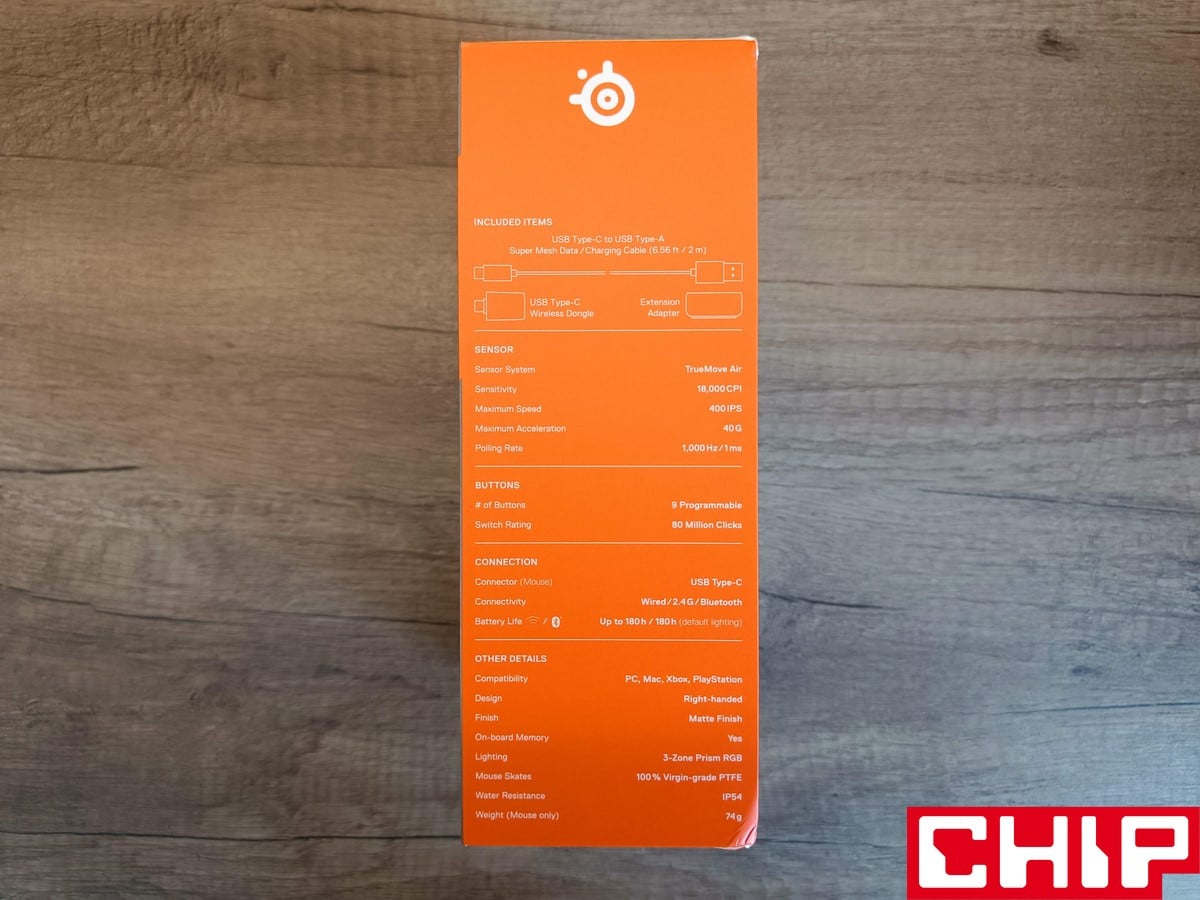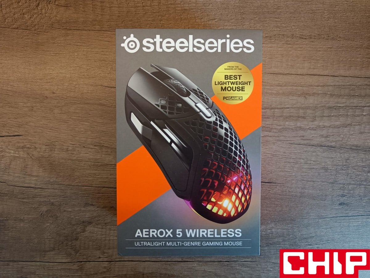 Od dłuższego czasu pudełka Steelseries towarzyszące nowym myszkom stały się charakterystyczne do tego stopnia, że trudno pomylić je z jakimkolwiek innym producentem. Nie inaczej jest z Aerox 5 Wireless, którego front wieńczy render myszki zwiastujący efektowne podświetlenie, a boki kartonu szereg informacji na jej temat.