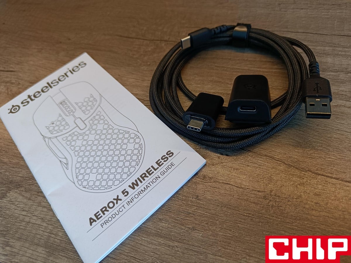 Wewnątrz jest dosyć bogato, bo oprócz lekkiego przewodu w materiałowym oplocie USB-A do USB-C o długości 200 cm, otrzymujemy instrukcję obsługi oraz dwa ważne elementy do pracy bezprzewodowej. Mowa o sporej wielkości nadajniku i odbiorniku Quantum 2.0 ze złączem USB-C oraz przejściówki z USB-C na USB-A, która wymaga podpięcia do komputera dołączonego przewodu Super Mesh. Jest to wymagane wyłącznie wtedy, kiedy Wasz sprzęt nie został wyposażony w USB-C.