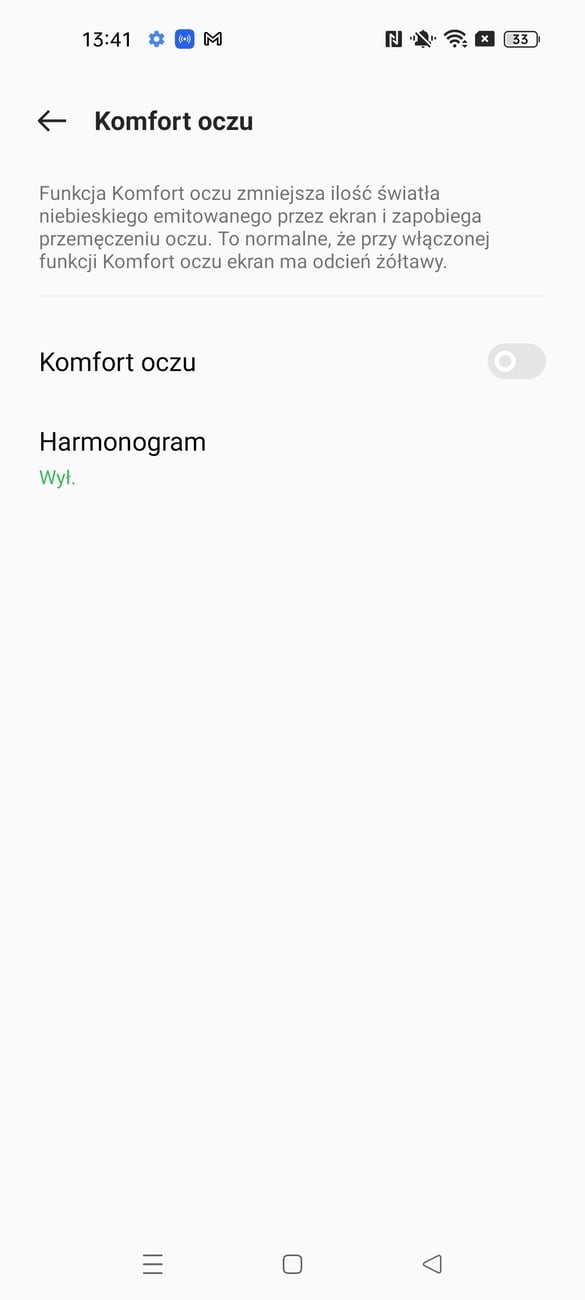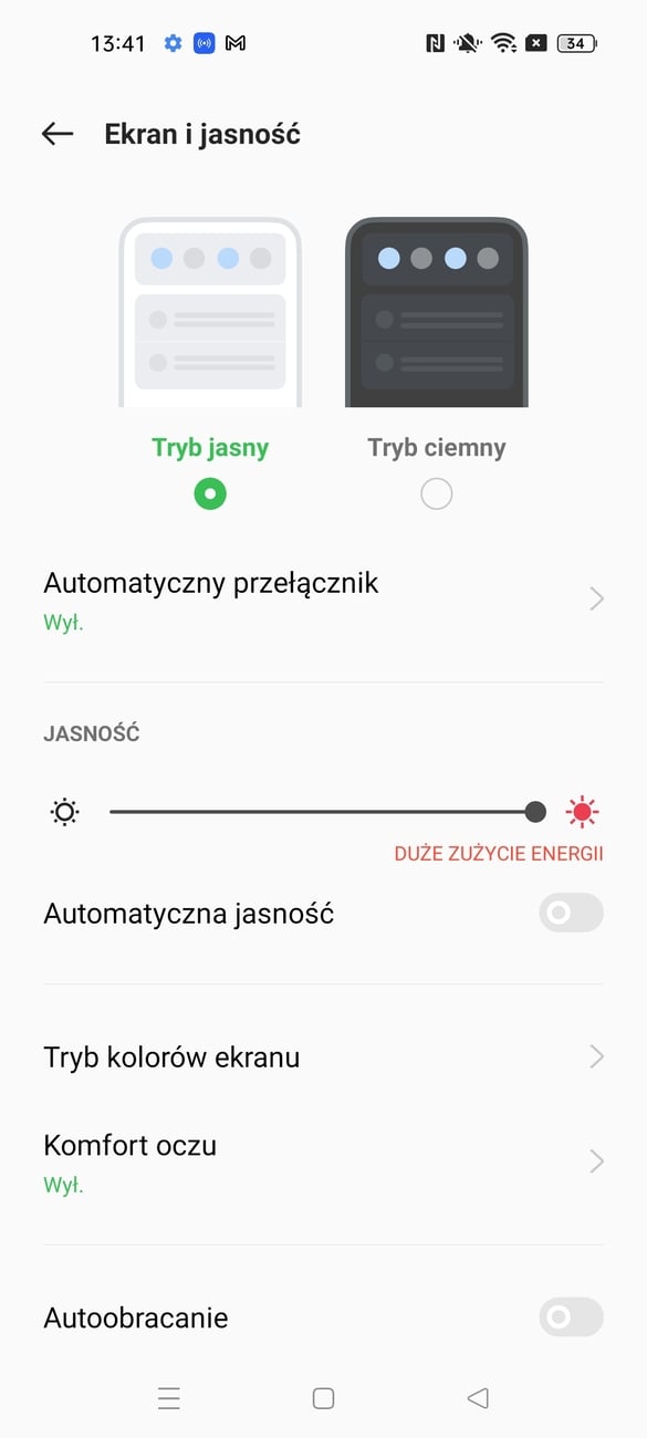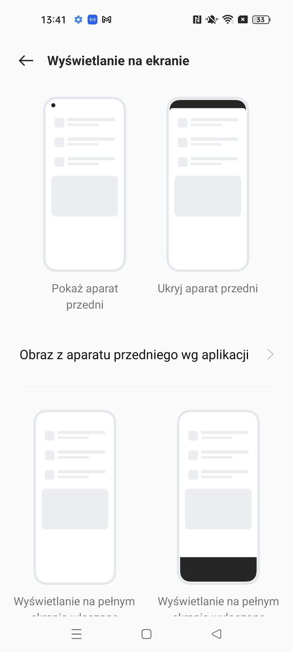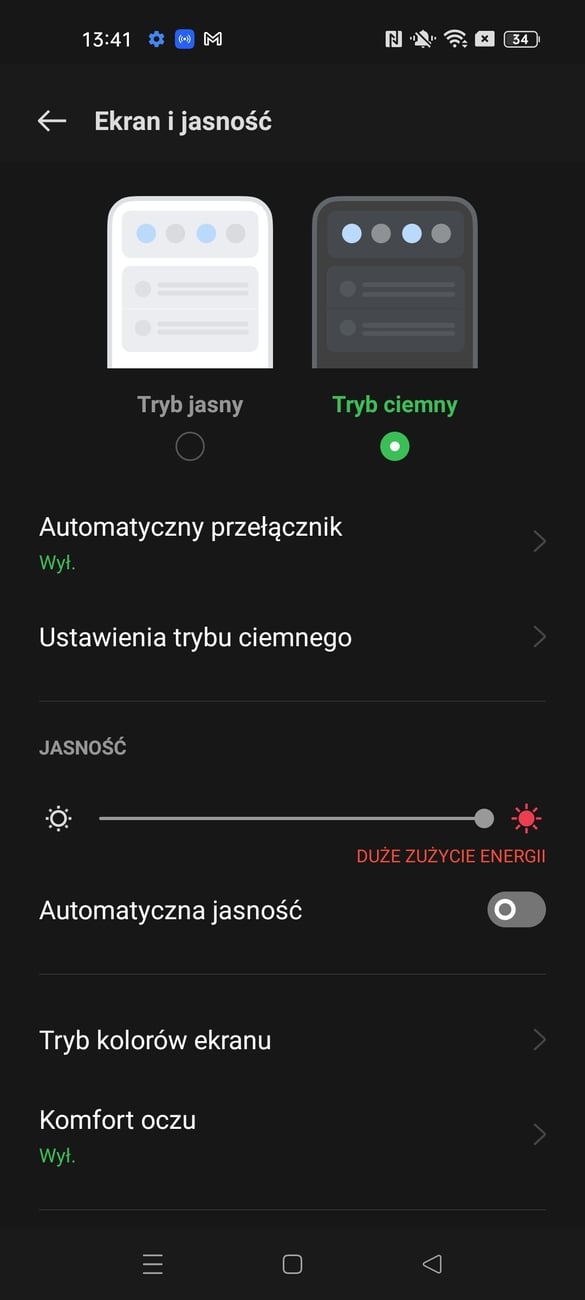 W ustawieniach znajdziemy tryb ciemny dla menu, filtr światła niebieskiego oraz możliwość regulacji nasycenia oraz temperatury barwowej kolorów. Jest również możliwość „ukrycia” wcięcia na przednią kamerę przez wyświetlenie na górnej krawędzi czarnego paska.