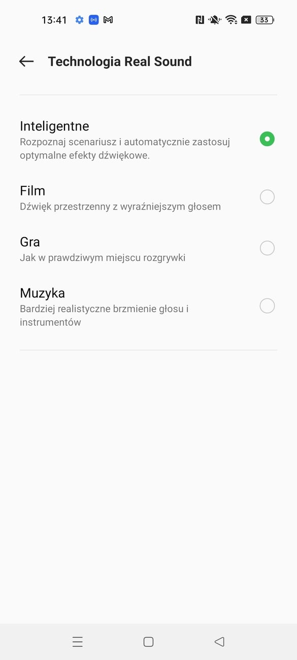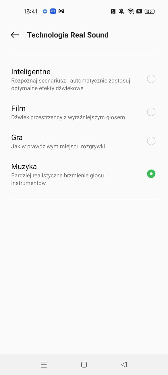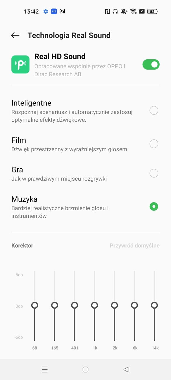 Oppo Reno7 Lite 5G ma na szczęście złącze miniJack. Po podłączeniu słuchawek dźwięk tu jest naprawdę dobrej jakości. Zbalansowany w całym zakresie pasma i dość przestrzenny. W ustawieniach znajdziemy technologię real Sound, która pozwala dopasować jakość dźwięku na słuchawkach do naszych indywidualnych preferencji.