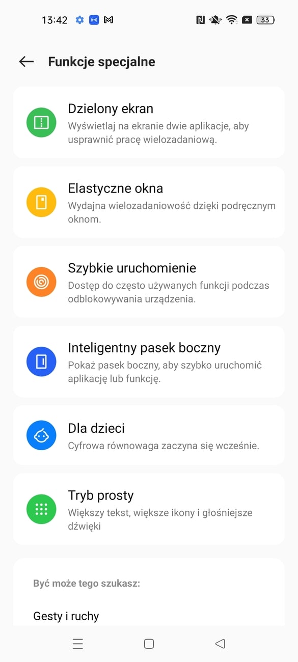 System działa jednak płynnie (jak na 60 Hz odświeżanie ekranu) i stabilnie. Nakładka producenta – ColorOS 12 jest czytelna i sensownie zaprojektowana. Oprócz standardowych gestów smartfon wspiera również gesty w powietrzu, ale jest to mało praktyczna funkcja na co dzień. Bardziej bajer. Tak czy siak można je wykorzystać do sterowania połączeniami oraz przewijania w powietrzu (działa w niektórych aplikacjach, np. w Facebooku). Niestety jest tu też sporo zbędnych (dla niektórych) aplikacji firm zewnętrznych. Screeny obrazujące wygląd systemu możecie zobaczyć poniżej.