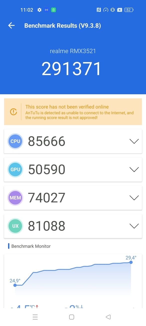 - Antutu Benchmark 9.3.7 – 291 371 pkt