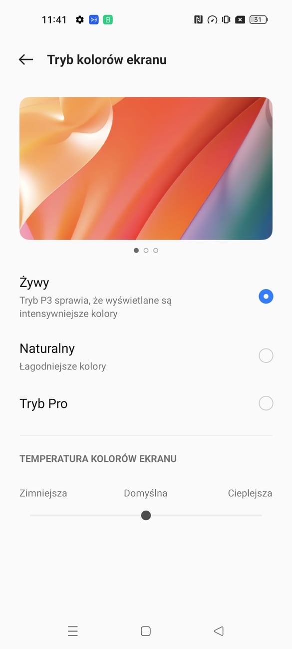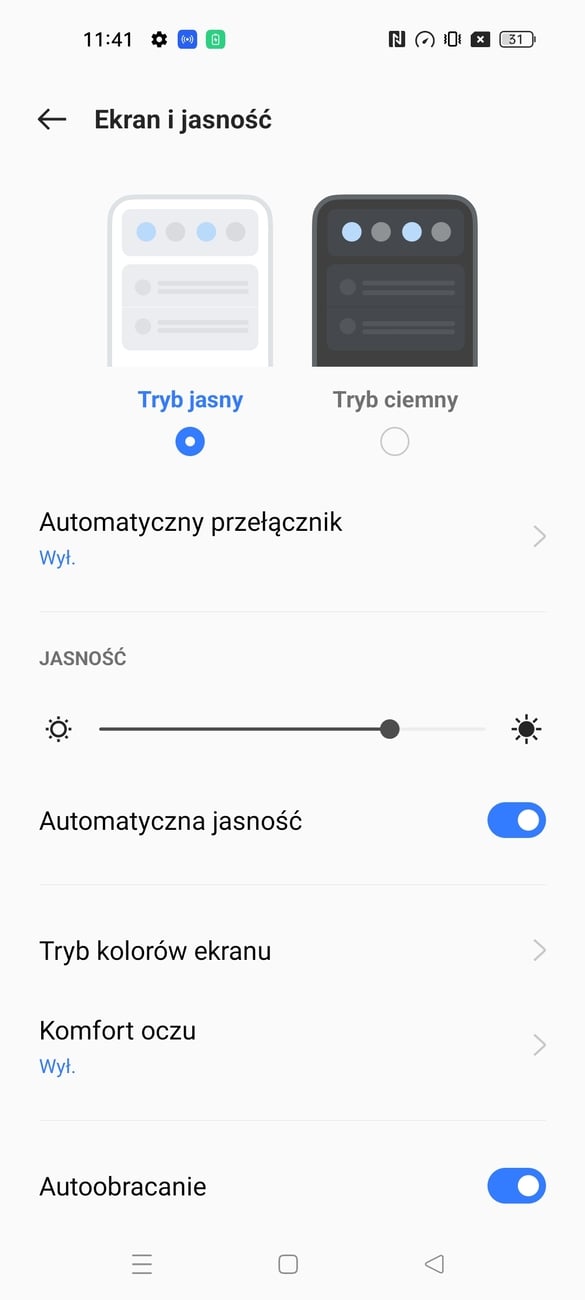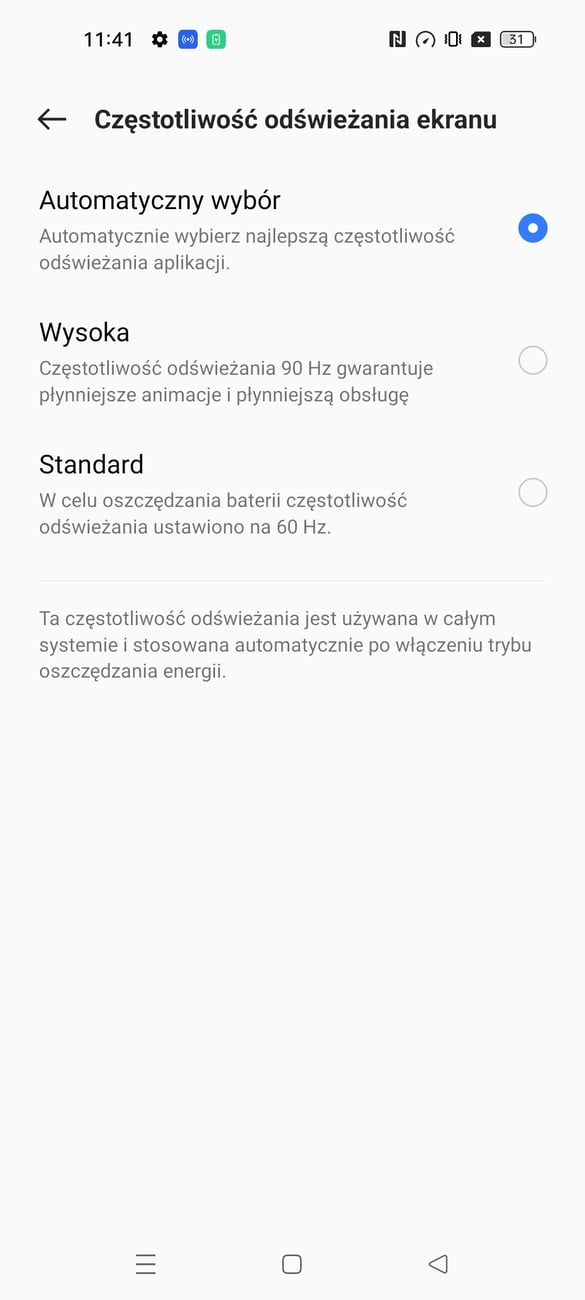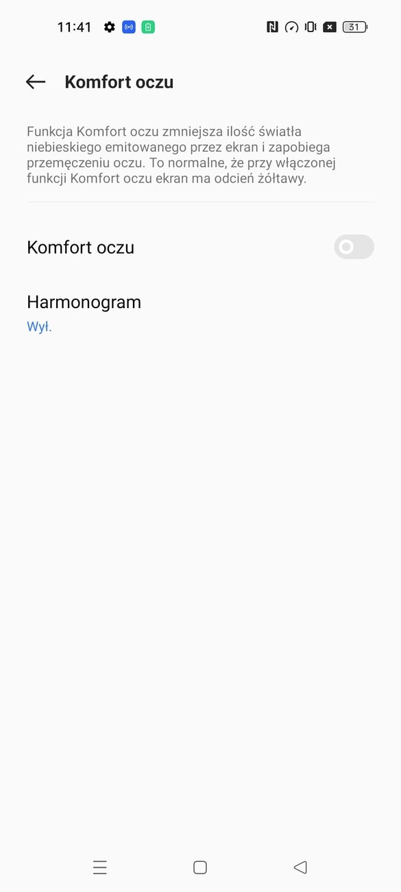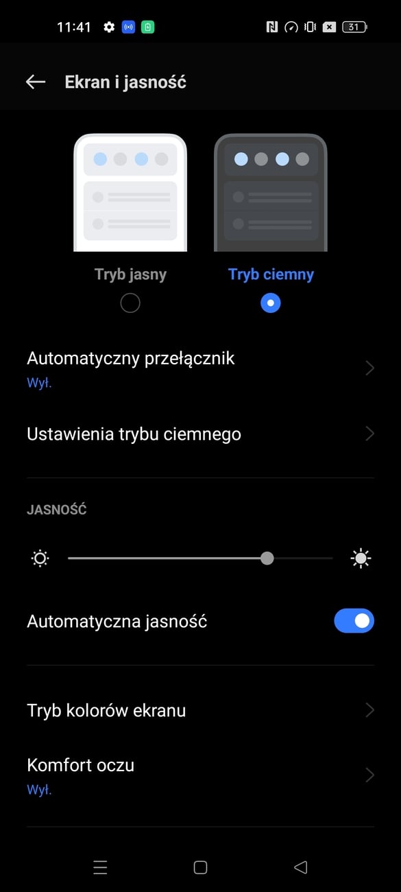 W ustawieniach znajdziemy tryb ciemny dla menu, filtr światła niebieskiego oraz możliwość przełączania się między 60 Hz a 90 Hz odświeżaniem ekranu. Możemy regulować również temperaturę i nasycenie barw. Standard.