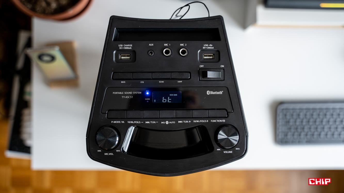 Toshiba TY-ASC51 możecie tak naprawdę dowolnie przenosić nawet w trakcie trwania imprezy. Głośnik ma specjalną rączkę, która to ułatwia i fakt – całość jest dosyć ciężka, ale nie ma tutaj jakiś większych problemów. Nie musicie też martwić się o dostęp do prądu. Dzięki wbudowanemu akumulatorowi 12 V 4 Ah możecie cieszyć się czasem odtwarzania muzyki wynoszącym ok. 5 h przy 80% głośności. Jeśli więc szykujecie grilla czy imprezę nad wodą to głośnik sprawdzi się perfekcyjnie.
