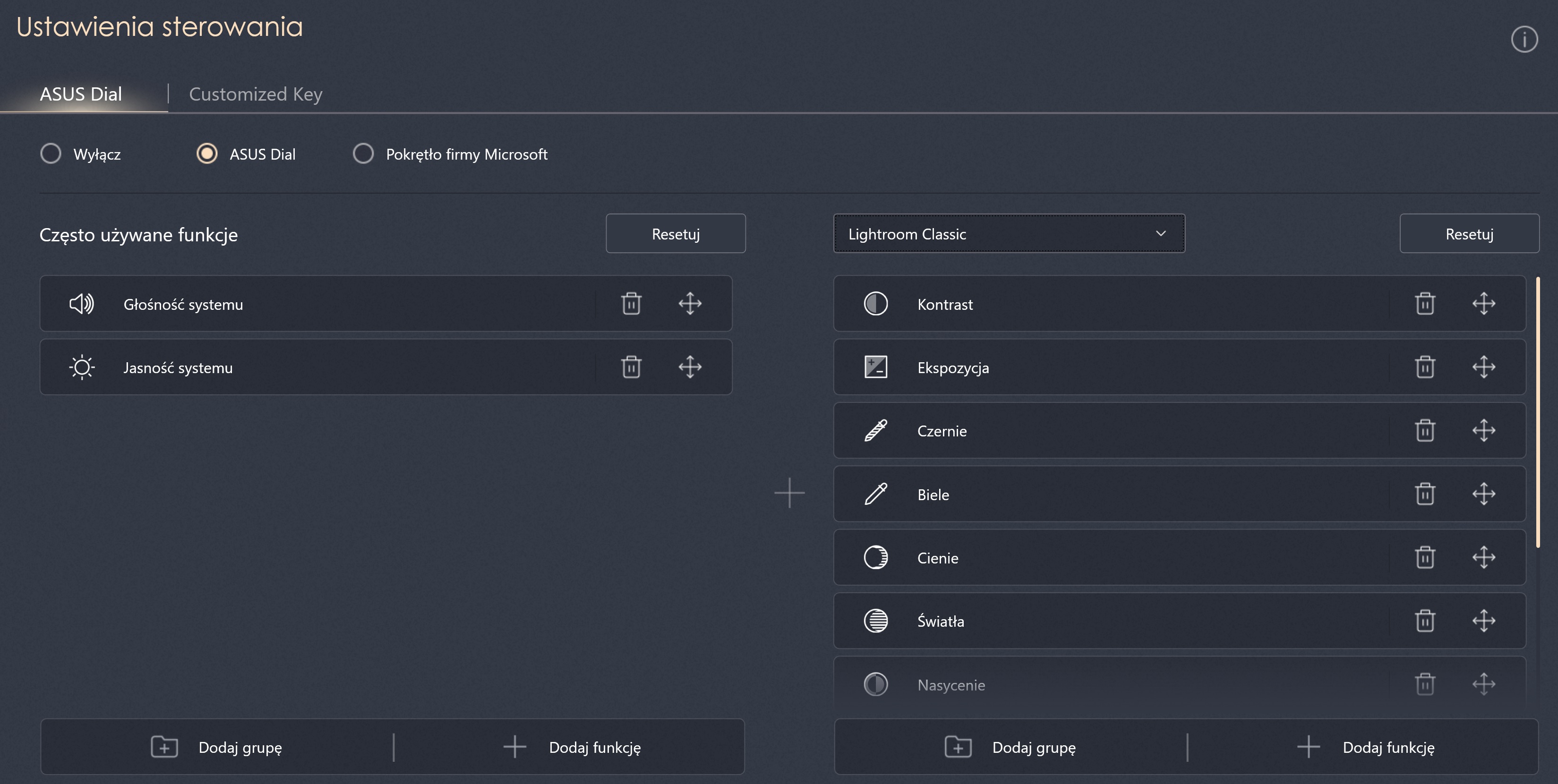 Do Asus Dial można przypisać różne funkcje dostępne w danym programie. W programach graficznych może to być regulacja odpowiednich parametrów (suwaków), zmiana obszaru zaznaczania czy grubości pędzla. Wciskając pokrętło, na ekranie pojawia się lista przypisanych do niego funkcji w danej aplikacji. Wybieramy tę, która nas interesuje i pokrętłem możemy precyzyjnie sterować jej parametrami. Więc na upartego jeśli przypiszemy do Asus Dial wszystkie funkcje edycji obrazu Adobe Lightroom, możemy obrobić całe zdjęcie tylko przez przekręcanie i obracanie pokrętła. No może poza przycięciem obrazu. Asus Dial sprawdzi się też w przewijaniu treści, osi czasu, w zasadzie wszędzie tam, gdzie tylko znajdziemy dla niego zastosowanie.