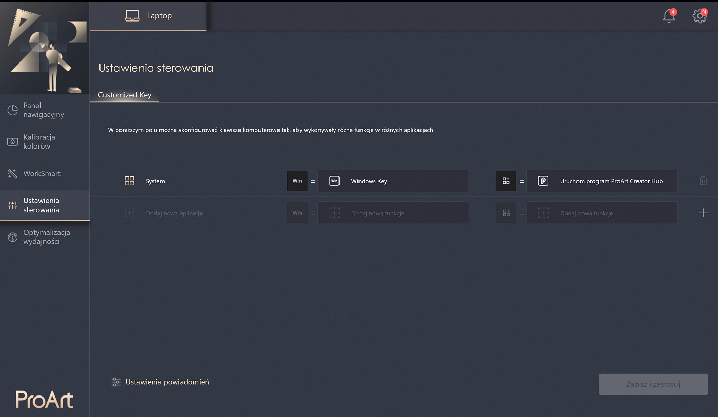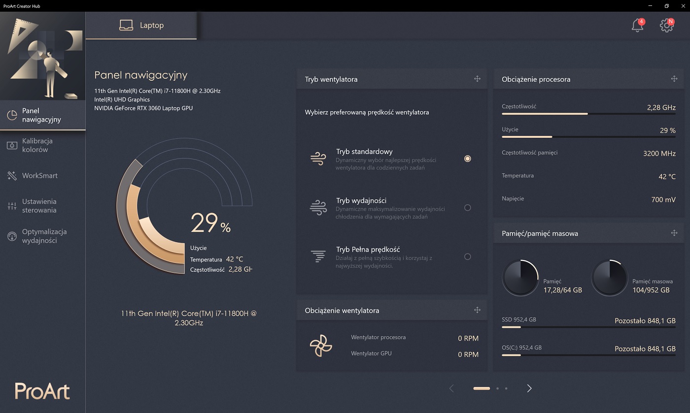 Zazwyczaj jeśli chcemy mieć odpowiednio ustawiony ekran, trzeba go skalibrować. W ten sposób możemy dodatkowo zmniejszyć choćby wskaźnik Delta E, mówiący nam o odwzorowaniu kolorów. Potrzebujemy do tego odpowiedniego oprogramowania oraz kolorymetru. Ale nie w tym przypadku. ProArt StudioBook 16 ma do tego odpowiednie oprogramowania ProArt Creator Hub. To hub będący centrum sterowania laptopem. Mamy tam szereg ustawień dotyczących wydajności oraz stały podgląd parametrów pracy podzespołów.