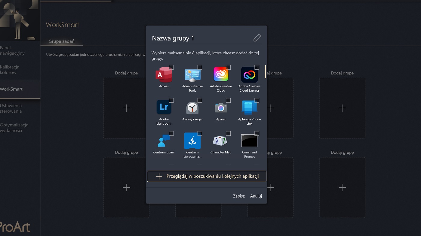 Tutaj też znajdziemy ustawienia ekranu. Możemy go na różne sposoby spersonalizować, ale też przeprowadzić kalibrację. Pierwszy raz spotykam się z taką możliwością i jestem pod dużym wrażeniem. Innym ciekawym rozwiązaniem jest tworzenie zestawów aplikacji. Możemy stworzyć grupę (do) czterech programów, które uruchomimy jedną ikoną na pulpicie i od razu mamy do dyspozycji wszystkie niezbędne programy graficzne czy biurowe.