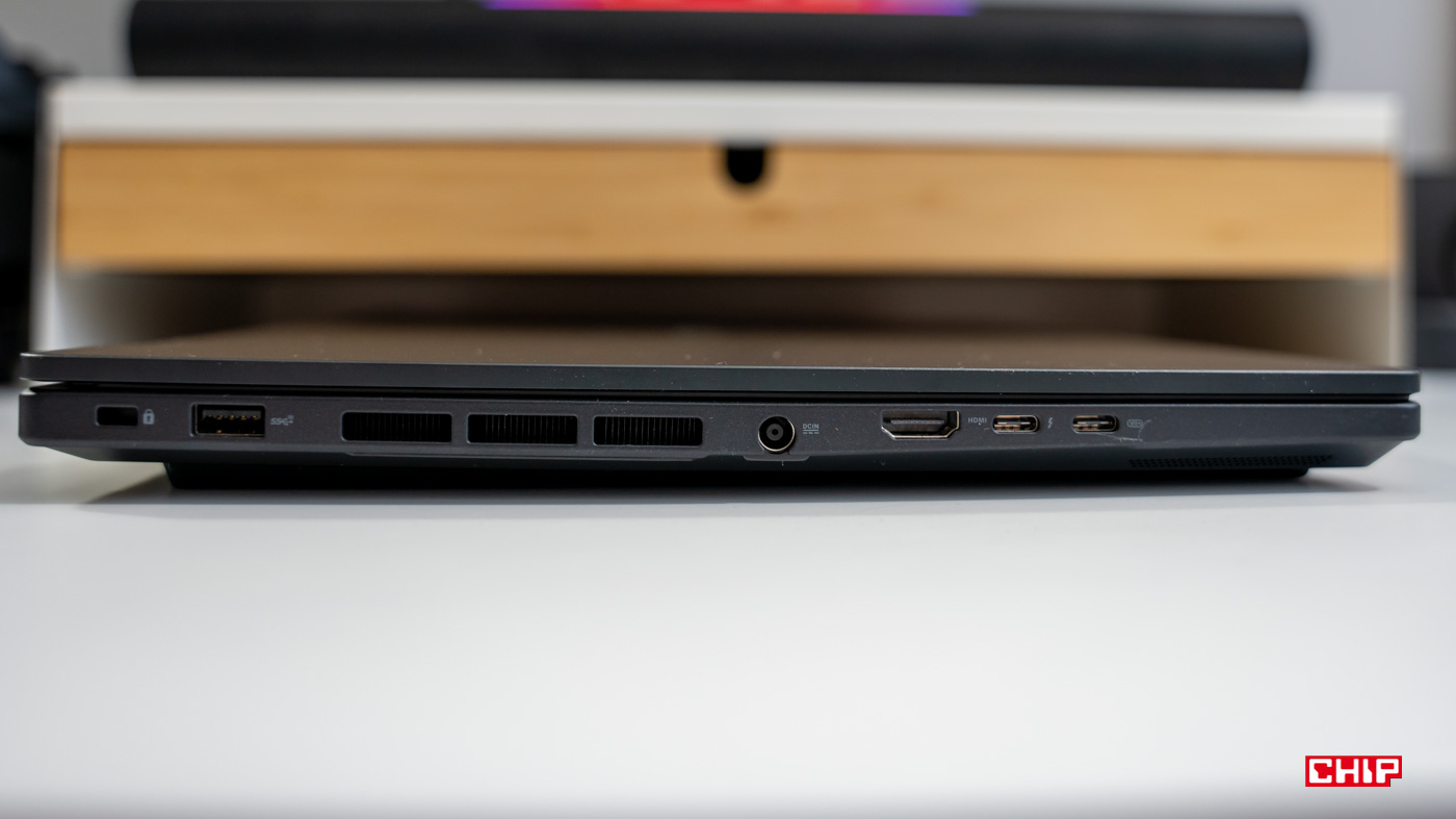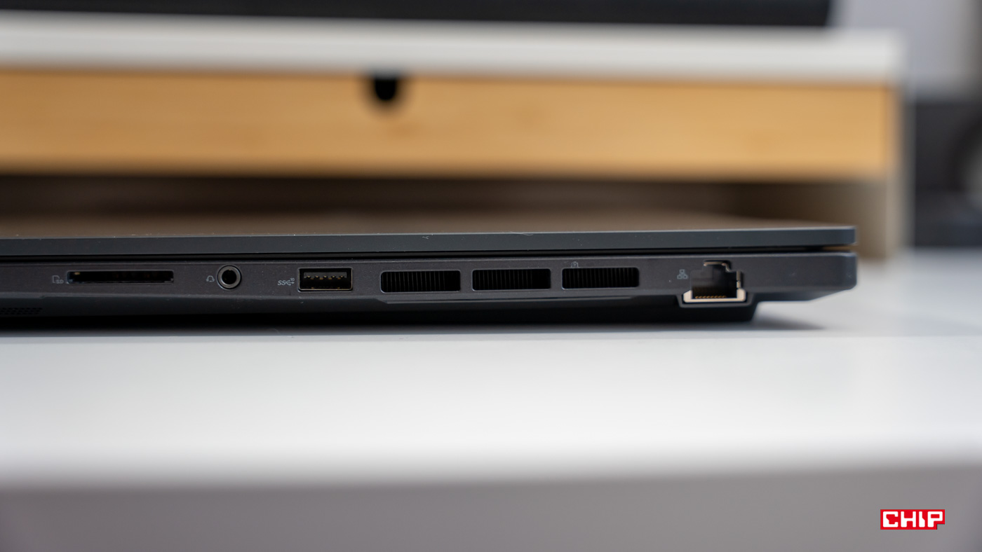 Pozostając przy specyfikacji, Asus ProArt StudioBook 16 rozpieszcza liczbą portów. Mamy tu dwa porty USB 3.2 Gen 2, dwa USB-C (jeden DisplayPort z Power Delivery, drugi Thunderbolt 4), HDMI 2.1, czytnik kart pamięci SD (dużych), gniazdo RJ-45, Jack 3,5mm oraz całość uzupełnia gniazdo zasilania.