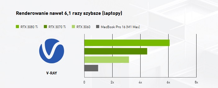 Zobaczmy kilka przykładowych wyników, jeśli chodzi o czas np. renderowania lub eksportu materiału, na tle MacBooka Pro 16 oraz wykonywania tej samej czynności przy pomocy głównie procesora i zintegrowanego układu graficznego. Lepsze wyniki są oczywiście efektem odpowiedniego wykorzystania mocy obliczeniowej karty graficznej.