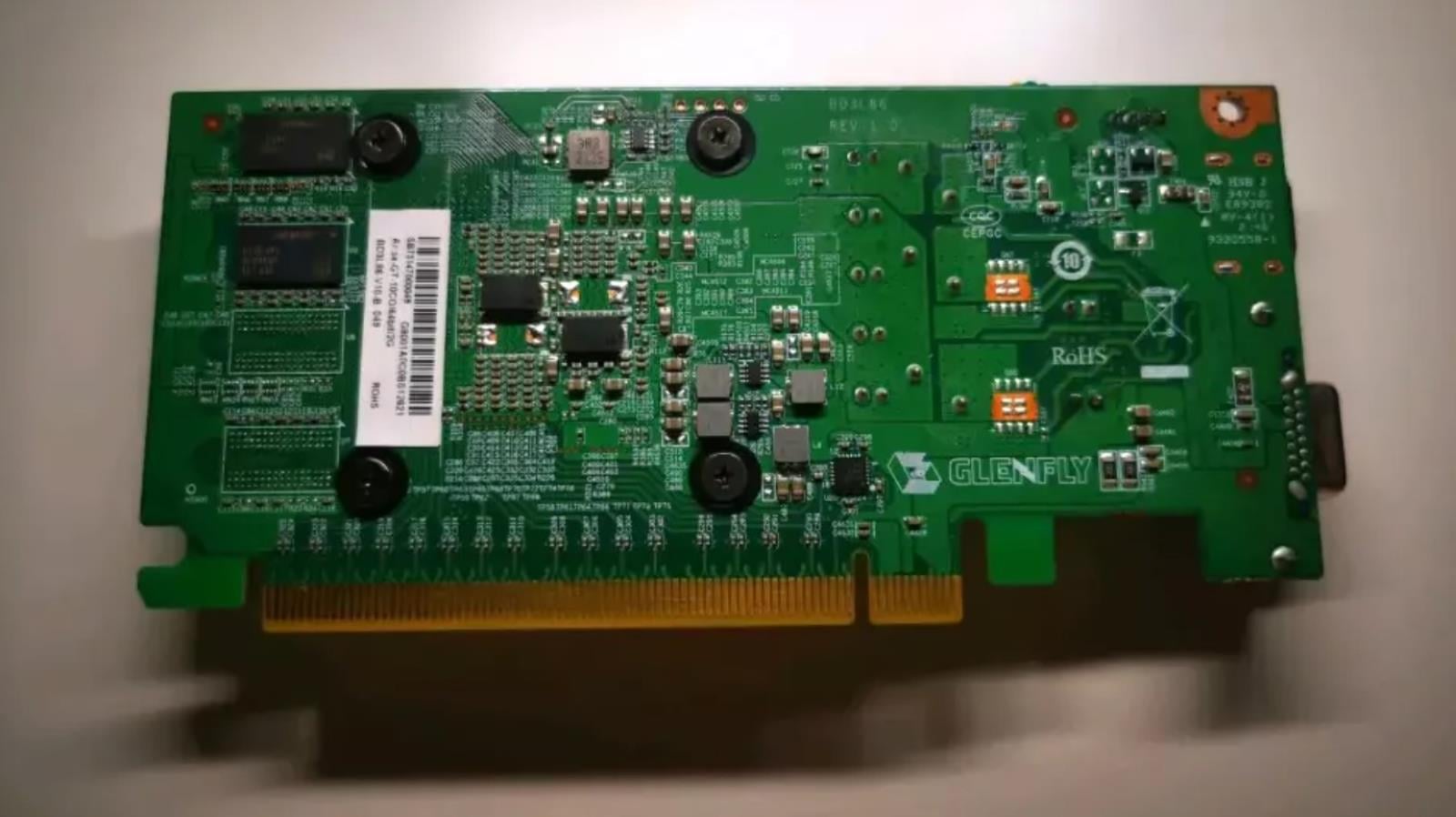 Jednak zdecydowanie najważniejsze jest to, co widać na pakiecie GPU. Oznaczenia potwierdzają, że to rzeczywiście produkt chińskiej firmy Genfly i model Genfly Arise-GT10C0. Chociaż o tego typu karcie graficznej słyszymy po raz pierwszy, to w praktyce jest to zapewne przetestowany dawniej Glenfly Arise 1020, a samo Arise-GT10C0 to albo oznaczenie bezpośrednio GPU, albo odpowiednik nazwy kodowej samej karty.