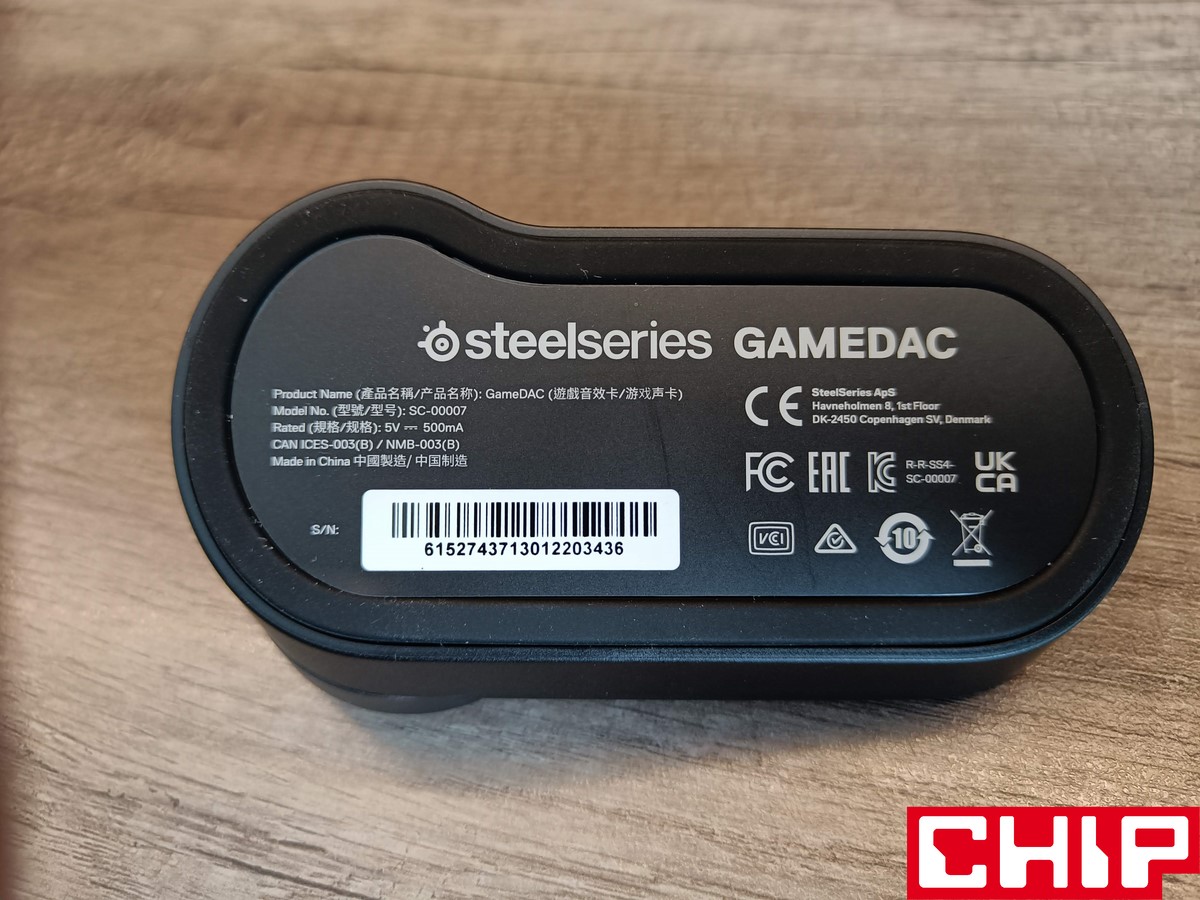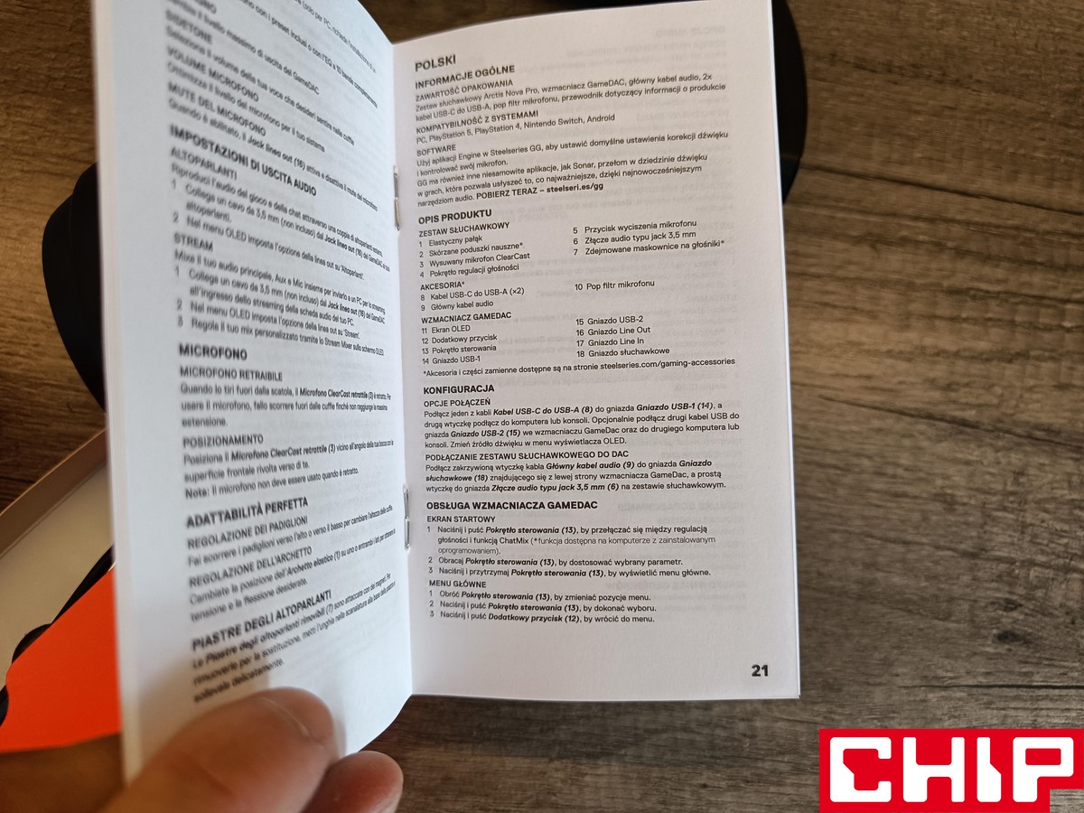 Dodatkowy osprzęt również robi wrażenie, bo oprócz instrukcji obsługi oraz pianki na mikrofon, znajdziemy w pudełku worek do transportu (w nim wspomaga nas opcja obracania muszli o 90 stopni), dwa przewody USB-A do USB-C (długość: 1,5 metra) oraz 4-polowy/5-polowy przewód jack 3,5 mm (1,2 metra). Wszystkie przewody wzmacnia gumowa osłonka, a najważniejszym elementem zestawu (obok słuchawek) jest mieszący się w dłoni, zewnętrzny konwerter DAC (z modułem ESS Sabre 9218PQ40), a dokładniej mówiąc “Hi-Res Certified GameDAC Gen 2”, który ma sprawiać, że Arctis Nova Pro (na papierze) będą przewyższać wszystkie inne gamingowe zestawy słuchawkowe.