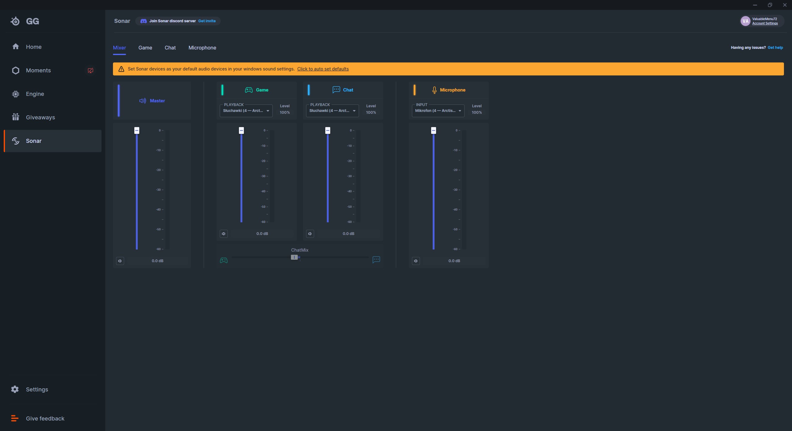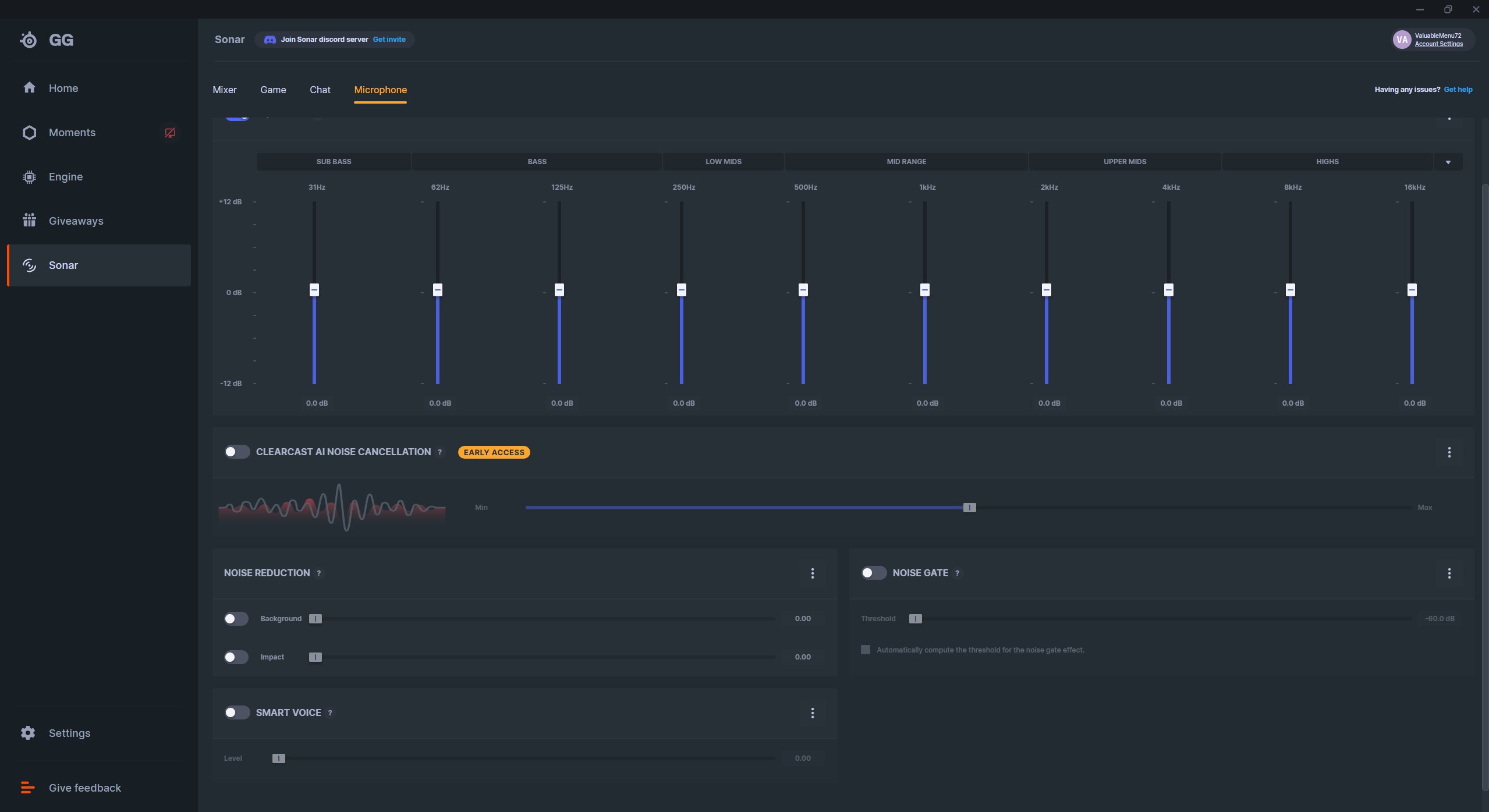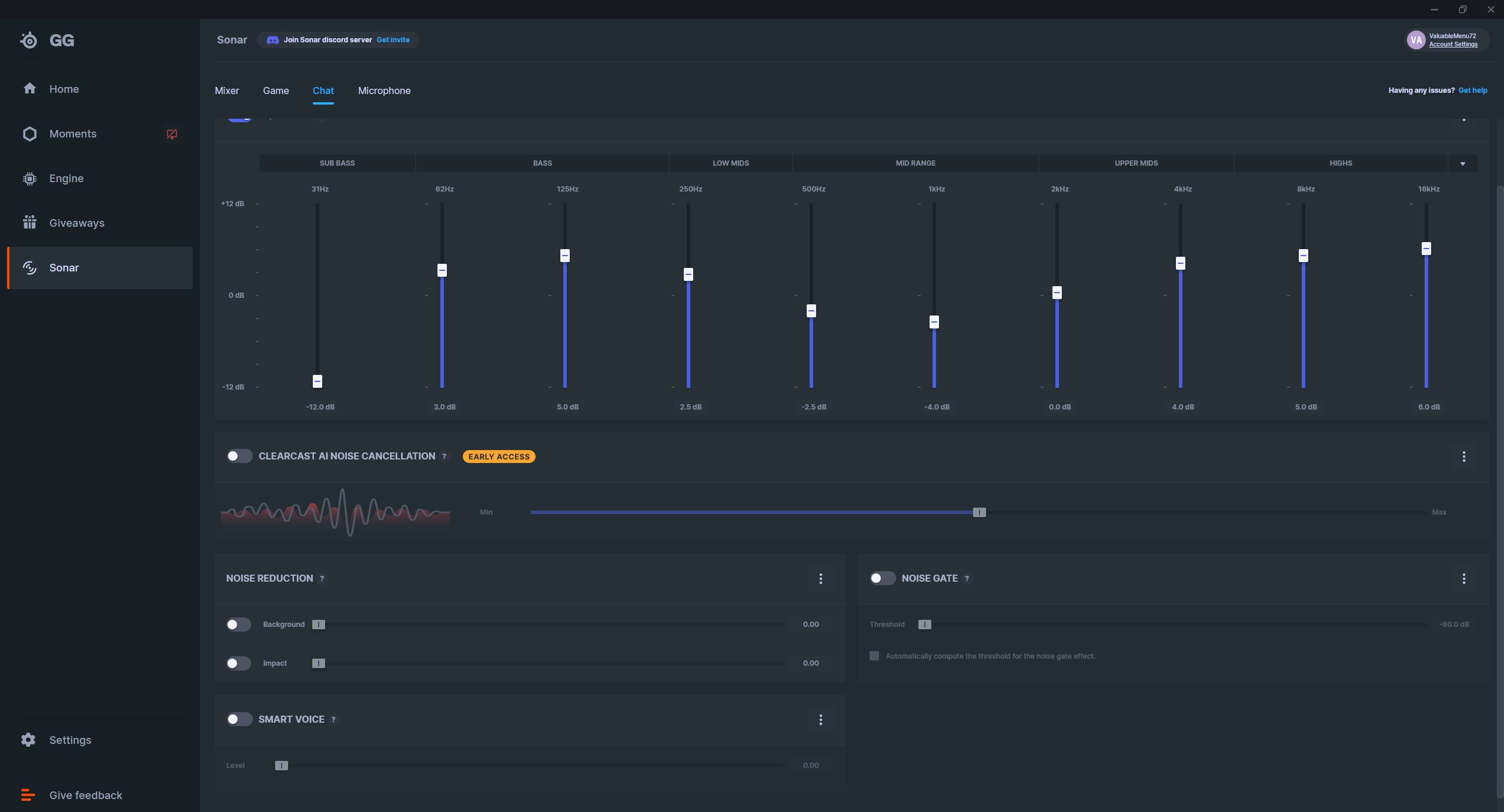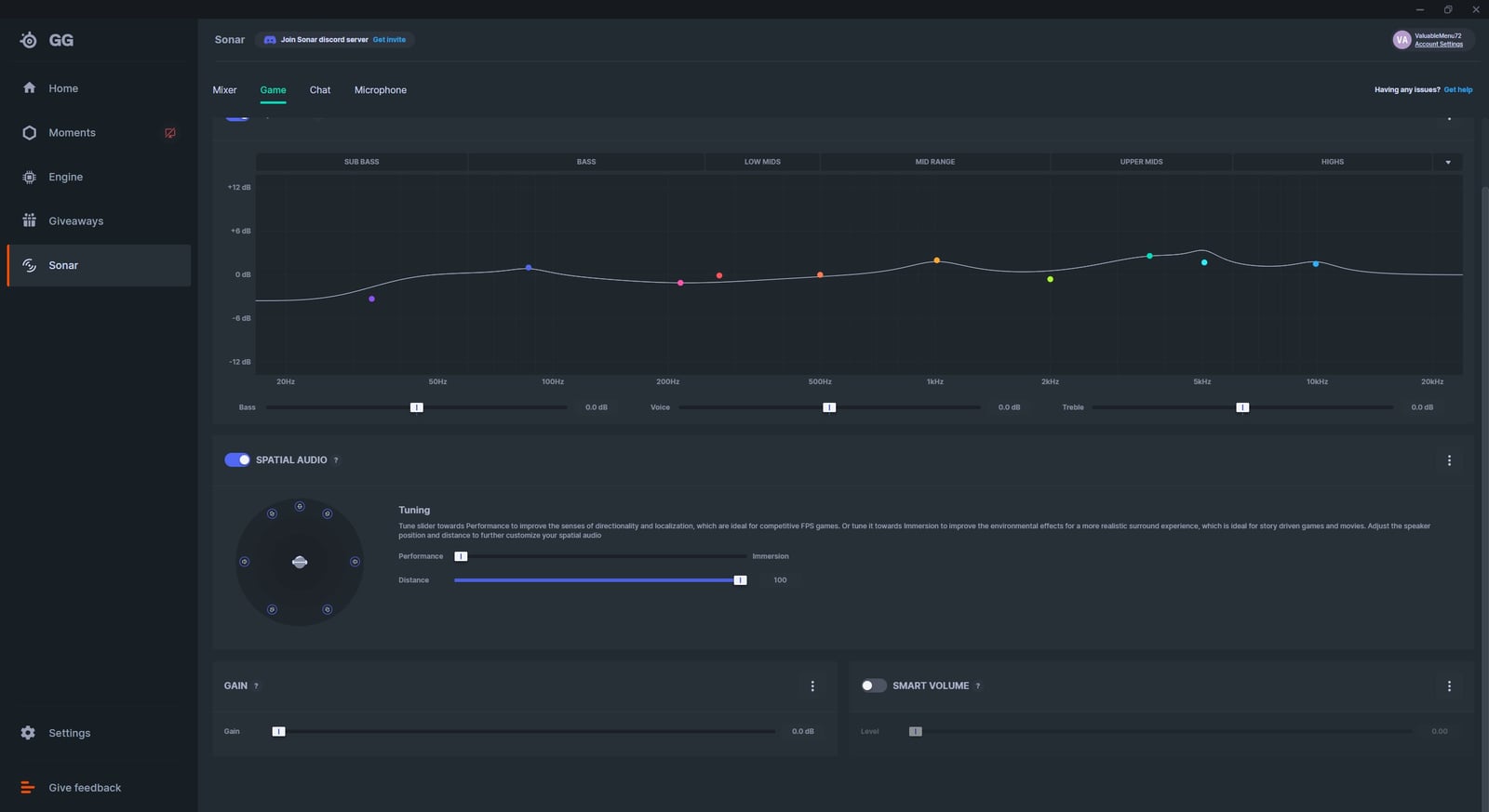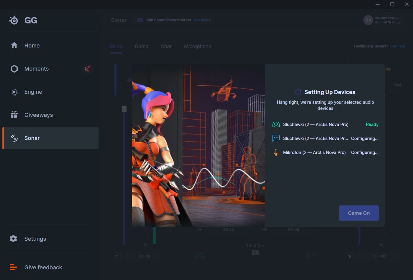 Podstawowa konfiguracja w oprogramowaniu sprowadza się do rozbudowanego equalizera, ustawień mikrofonu oraz zachowania zewnętrznego modułu. Znacznie więcej opcji oferuje zakładka Sonar, która pozwala rozdzielić poziom głośności gry/muzyki oraz czatu głosowego (np. Discorda), a dodatkowo pobawić się equalizerem dla każdego z tych źródeł, a nawet mikrofonu. Tam też znajdziemy opcje związane z wirtualnym dźwiękiem.