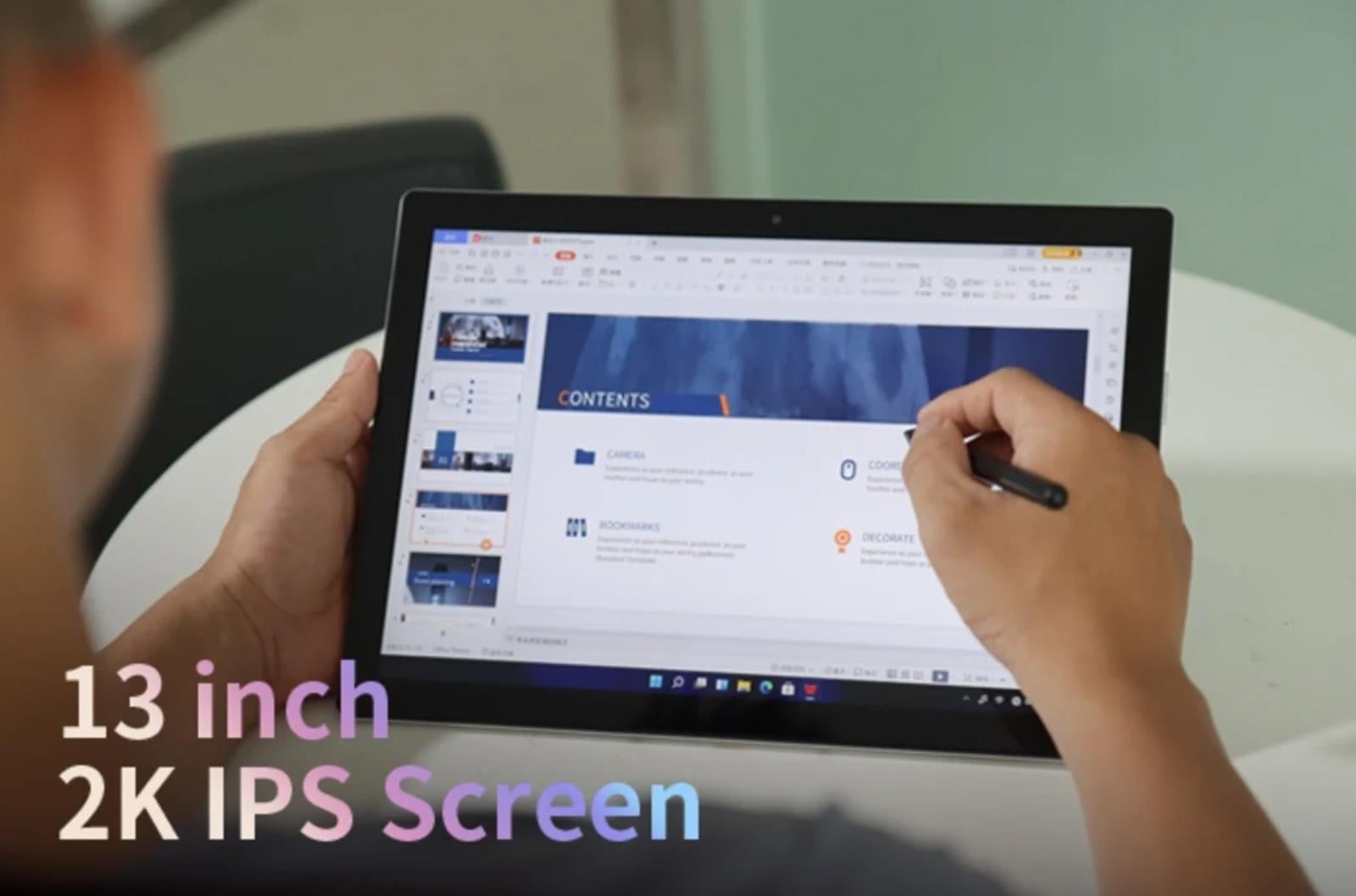Zacznijmy od tego, że ekran OneNetbook T1 sprowadza się do 13-calowego panelu IPS o proporcjach 15:10, czyli rozmiarowo to standardowy “laptopowy” sprzęt. Jakość ekranu robi jednak wrażenie, bo nie tylko obejmuje 198 ppi (rozdzielczość 2160×1440), ale też pokrywa w 100% paletę sRGB, co dla osób szczególnie wyczulonych albo po prostu potrzebujących wysokiej jakości, jest kluczowe. Zwłaszcza że to tablet dla twórców, dlatego też jego ekran jest obsługiwany przez rysik o 4096 poziomach nacisku z opóźnieniem 21 ms.