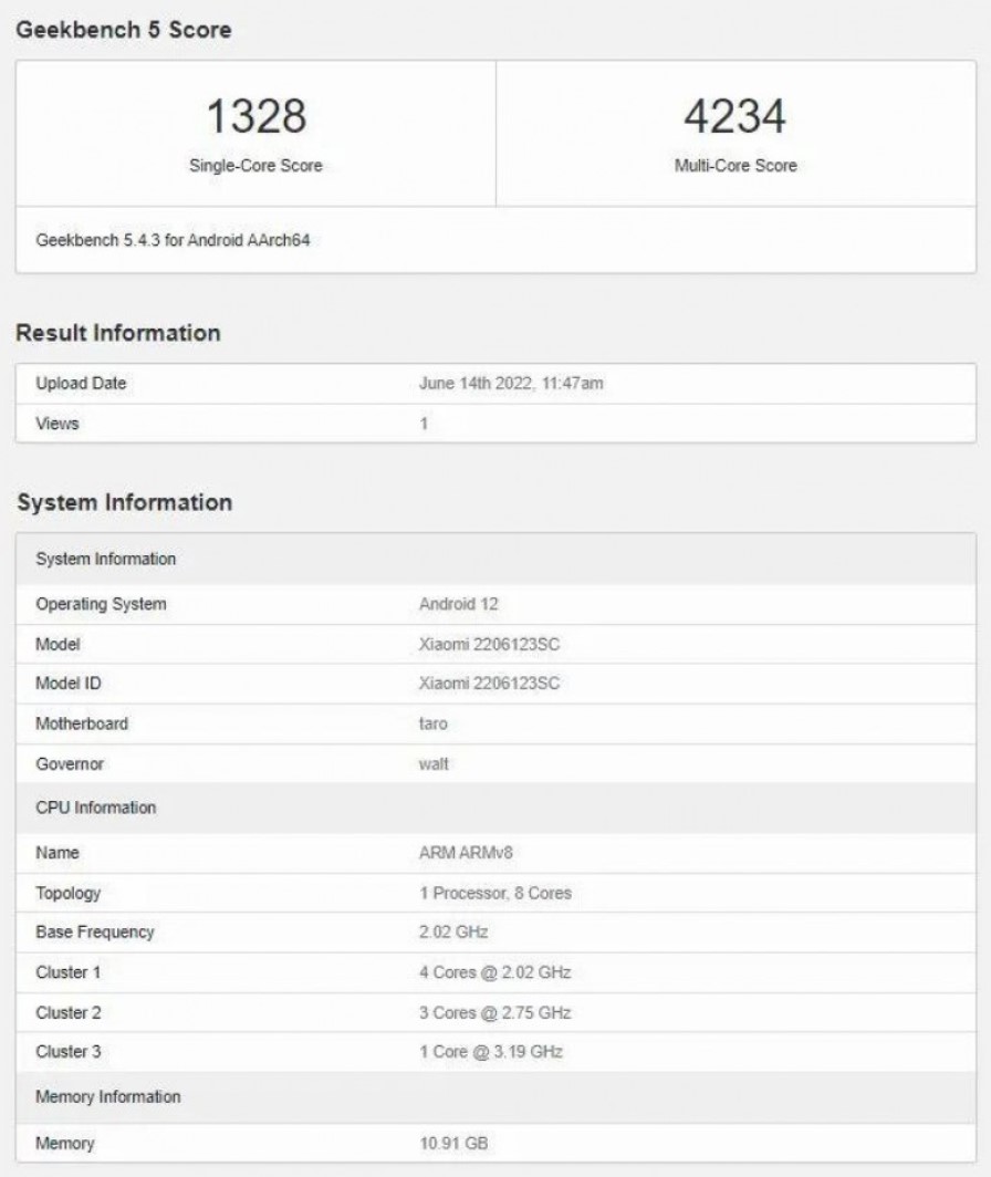 O obecności Snapdragona 8+ gen 1 na pokładzie tego modelu mówi się już od jakiegoś czasu. Była to zresztą pierwsza informacja, jaką dostaliśmy na jego temat. Teraz w bazie Geekbench pojawił się model o numerze 2206123SC, którym jest właśnie Xiaomi 12S. Oprócz potwierdzenia SoC, testowany model wyposażono w 12 GB pamięci RAM i system Android 12, prawdopodobnie z nakładką MIUI 13. W teście jednordzeniowym smartfon uzyskał 1328 punktów, zaś w wielordzeniowym – 4234 punkty.
