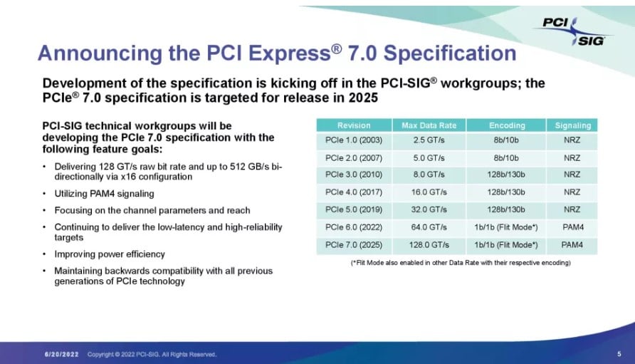 Zgodnie z oczekiwaniami przejście na PCIe 7.0 wymusi krótsze i bardziej jakościowe połączenia fizyczne, a w ogólnym rozrachunku interfejs stanie się wydajniejszy pod kątem zużycia energii. Na sprzęty wykorzystujące PCIe 7.0 poczekamy jednak długo, bo tak jak obecnie dopiero przyzwyczajamy się do PCIe 4.0 i oczekujemy PCIe 5.0, tak nie myślimy nawet o PCIe 6.0, choć te sprzęty trafiły już na rynek profesjonalny. Dlatego też, wedle oczekiwań po tym, jak specyfikacja PCIe 7.0 pojawi się w 2025 roku, świat ujrzy urządzenia końcowe dopiero w 2028 roku.