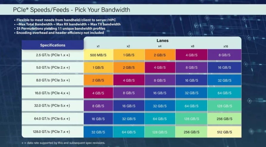 PCI-SIG to konsorcjum stojące za interfejsem PCIe, czyli otwartym standardem przemysłowym, w którego skład wchodzi ponad 900 firm członkowskich. Według jego ogłoszenia, interfejs PCIe 7.0 zapewni oszałamiającą dwukierunkową przepustowość rzędu 512 GB/s w połączeniu x16, choć warto podkreślić, że nie jest to rzeczywista ilość tego, jak wiele danych będzie można przepchnąć przez ten interfejs w ciągu sekundy.
