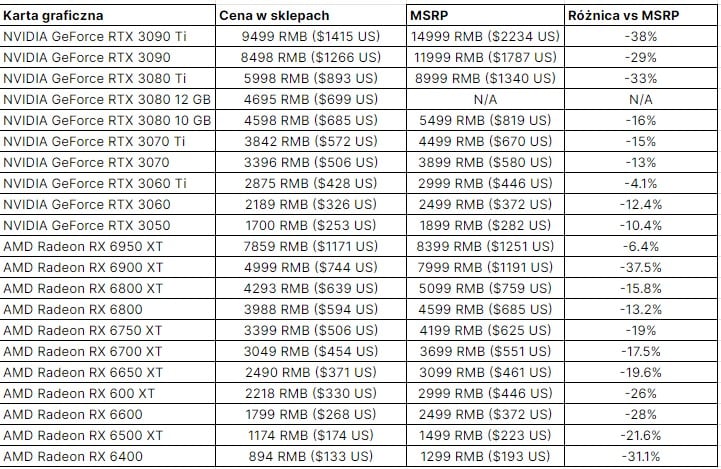 Przykładowo, zdecydowanie zbyt drogi GeForce RTX 3090 Ti spadł z 2234 do 1415 dolarów, czyli o aż 38%. Tuż za tym wynikiem plasuje się kosztujący teraz 744, a nie 1191 dolarów Radeon RX 6900 XT (spadek o 37,5%). Podobnie sprawa ma się z RTX 3090 oraz RTX 3080 Ti, które zaliczyły spadki o kolejno 29 i 33%, obniżając ceny do odpowiednio 1266 i 893 dolarów.