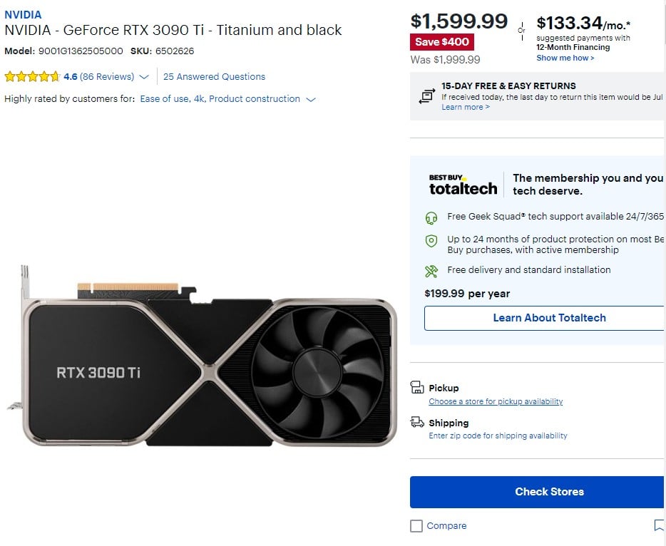 Jak bowiem wynika z oferty w BestBuy, czyli sklepie odpowiadającym za sprzedaż kart graficznych NVIDIA w wersji Founders Edition, cena RTX 3090 Ti spadła z 1999 do 1599 dolarów. Jako że Best Buy jest oficjalnym i bezpośrednim partnerem NVIDIA sprzedającym modele Founders Edition wyłącznie w Stanach Zjednoczonych, można już teraz powiedzieć, że MSRP zostało oficjalnie obniżone o 400$… co w Polsce nie ma większego znaczenia. Ceny bowiem ciągle wynoszą grubo ponad 10000 zł za wersje niereferencyjne.