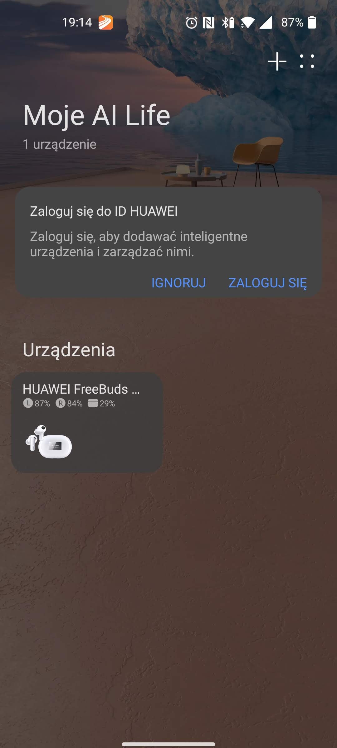 Jeśli z kolei o aplikację AI Life idzie, Huawei postawił w jej przypadku na doskonale znany i pielęgnowany od dłuższego czasu format HUBu dla wielu sprzętów tego producenta. W głównym menu możemy wybrać słuchawki z pola wyboru, podglądając jednocześnie poziom naładowania zarówno słuchawek, jak i etui.