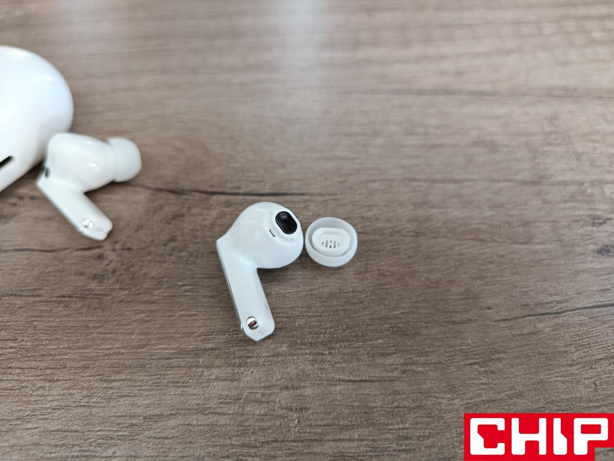 W wersji białej możemy z łatwością rozpoznać wszystkie najważniejsze elementy składowe dzięki kontrastowi, na jaki postawił projektant. Tak też srebrne piny ładujące znajdują się na bokach pałąka, którego spód obejmuje dwie dziurki na mikrofo. Poza tym na tylnej części Freebuds Pro 2 doszukamy się siateczki chroniącej drugi mikrofon, a na tej wewnętrznej zarówno czujnika obecności słuchawek w uchu, jak i kolejnej metalowej siateczki. Trzeci mikrofon znalazł się z kolei tuż przy miejscu do montażu gumki i pełni funkcję tego wewnętrznego.