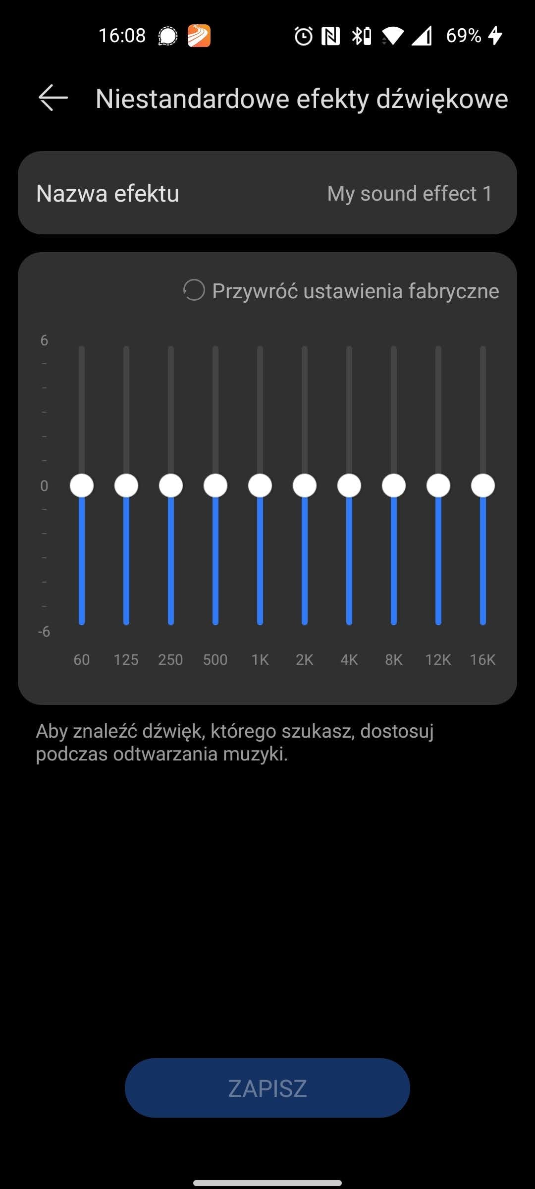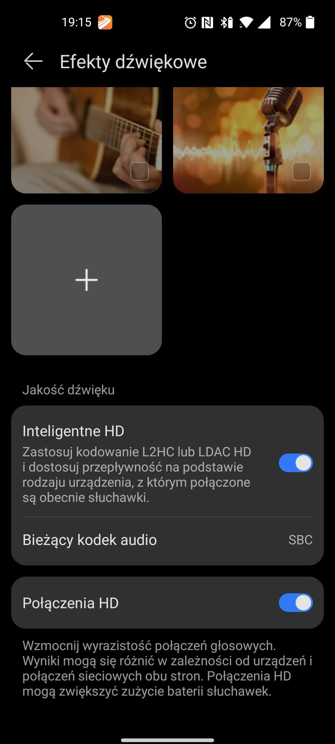 Wtedy zostaniemy przeniesieni do głównej zakładki, umożliwiającej nam przede wszystkim sprawdzenie aktualnie podłączonych urządzeń (FreeBuds Pro 2 wspierają do 2 jednocześnie), ustawienie aktualnego trybu działania (ANC/Otoczenie/Off z możliwością dostosowania tego pierwszego), dobranie predefiniowanego lub własnego equalizera i wreszcie podejrzenia aktualnie wykorzystywanego kodeka audio (LDAC, L2HC, SBC, AAC), który wybiera się automatycznie po wykryciu urządzenia, z jakim ma do czynienia, dzięki funkcji Inteligentne HD. Poza tym opcja Połączenia HD dodatkowo dba o jakość rozmów telefonicznych.