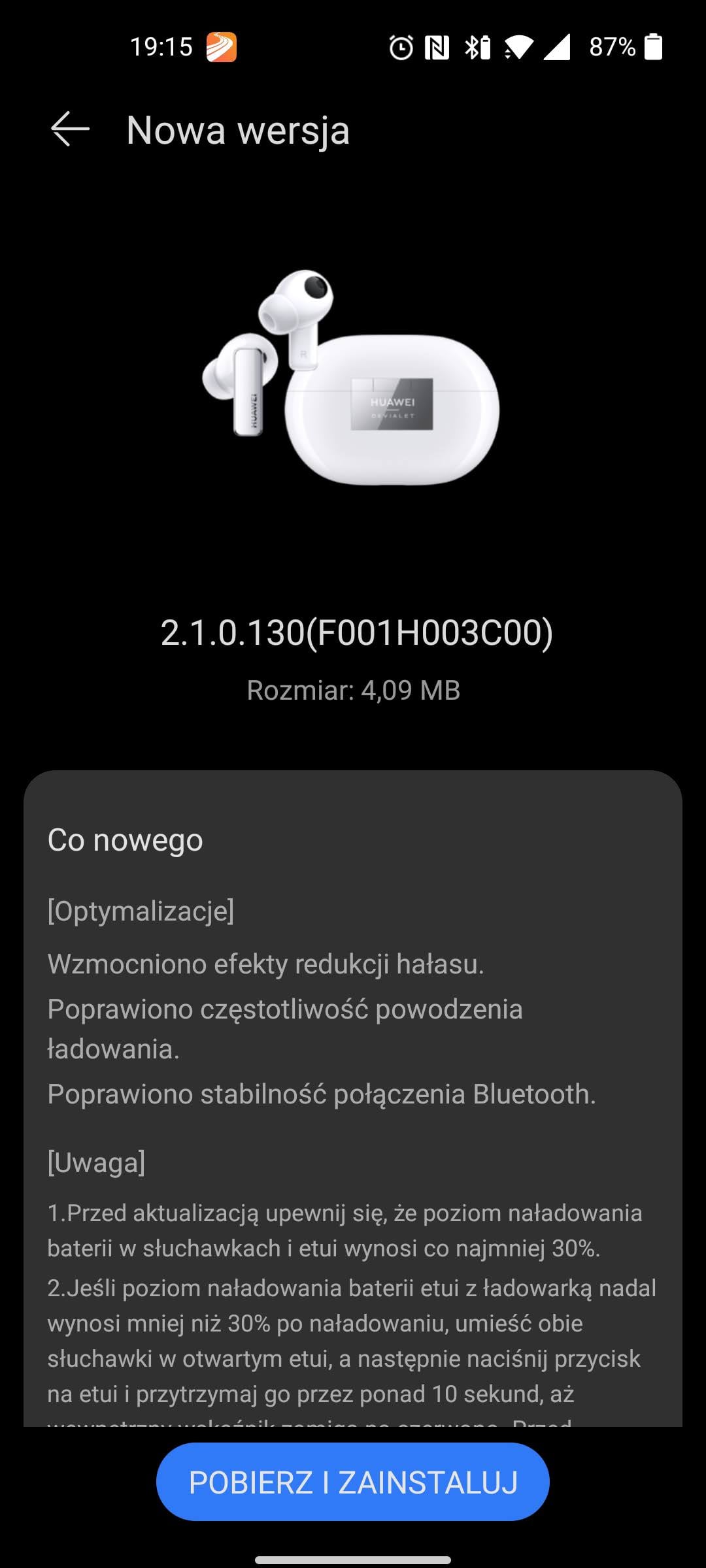 Początek zgłębiania możliwości FreeBuds Pro 2 może być dla Was nieco utrudniony, jako że moja aplikacja AI Life na Androida odmawiała współpracy z tym modelem. Zmieniło się to dopiero po tym, jak pobrana ze Sklepu Play apka zmusiła mnie do pozwolenia jej na instalacje innej, najnowszej i poprawnej już aplikacji AI Life, co wymagało udzielenia zgody na instalację oprogramowania z nieoficjalnych źródeł. Wspominam o tym głównie po to, aby przygotować Was na taką żonglerkę aplikacjami, jeśli zacznie dręczyć Was problem z wykryciem FreeBuds Pro 2 przez telefon.