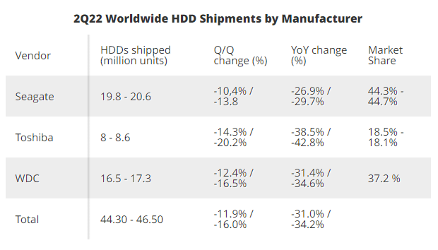 Jest to spowodowane zwyczajnym brakiem popytu ze strony klientów, a idąc dalej i sięgając np. do 2010 roku, spadek idzie w setki procent. Przed dwunastoma laty w całym roku dostarczono bowiem 651 mln HDD, przez co średnio na kwartał przypadało ~162 mln sztuk. Są to liczby, które zdecydowanie nie zależą wyłącznie od segmentu konsumenckiego, ale też profesjonalnego, czyli centrów danych.