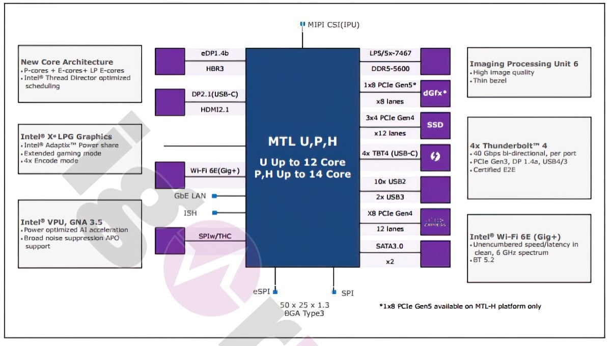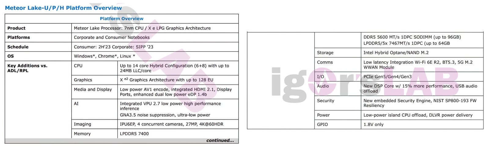 To jednak nie koniec nowych informacji, bo powyższy slajd wspomina też o obecności iGPU na bazie architektury Intel Xe LPG, ośmiu liniach PCIe 5.0 i maksymalnej liczby rdzeni rzędu 14 (6+8) oraz 12 (4+8). Tyczy się to oczywiście rodziny procesorów mobilnych, bo odpowiednio Meteor Lake-H oraz -P. Te mają dodatkowo wspierać do 96 GB DDR5-5600 lub 64 GB LPDDR5X-7467 pamięci podręcznej.
