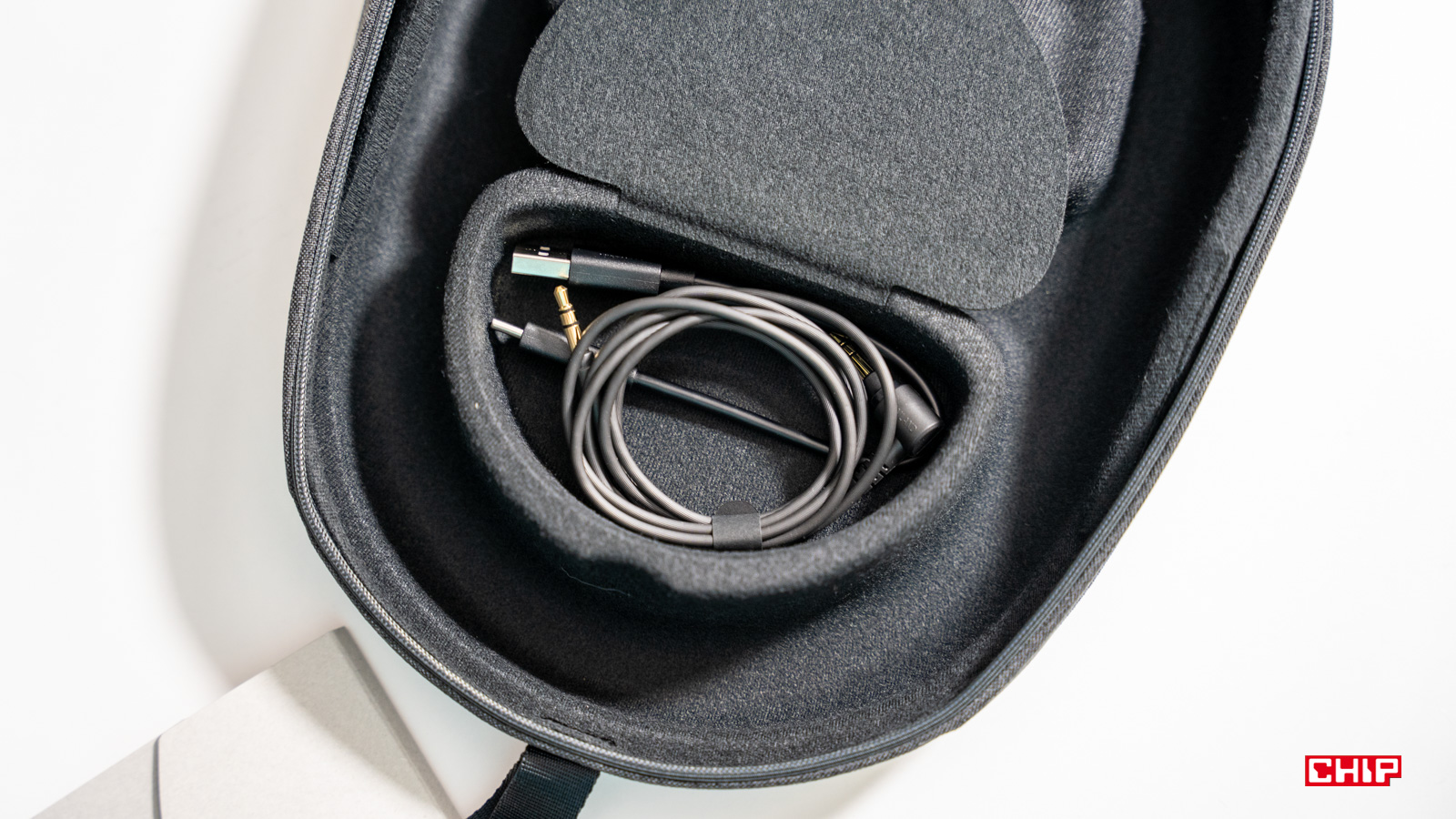 W zestawie znajdziemy solidne, ale duże etui, przewód Jack 3,5mm o długości 1,2m oraz kabel USB-C.