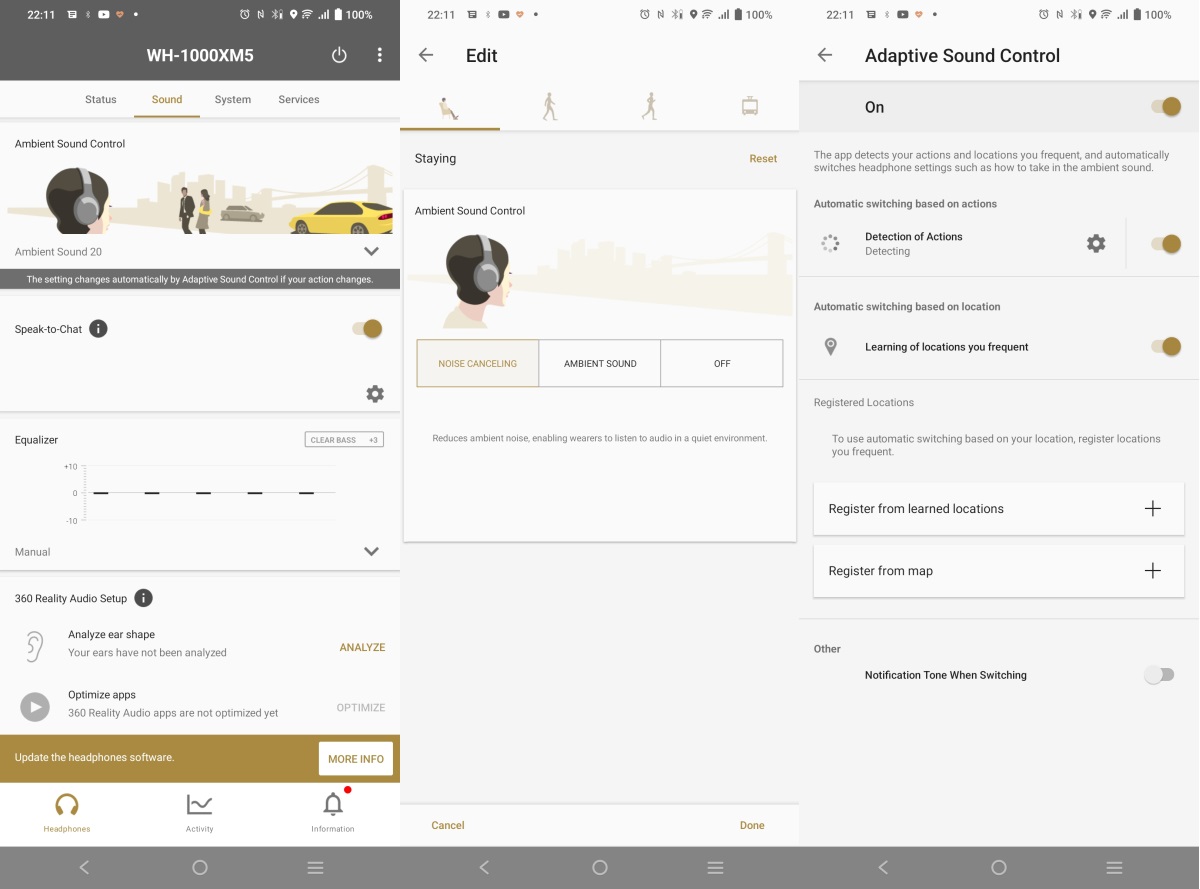 Jeśli chcemy w pełni wykorzystywać możliwości słuchawek Sony WH-1000XM5 musimy zaopatrzyć się w aplikację mobilną. To ona pozwala na korzystanie z rozbudowanych funkcji, związanych choćby z działaniem aktywnej redukcji hałasu (ANC), analizą kształtu ucha, czy dźwięku 360. Tutaj mamy też ustawienia działania skrótów na obudowie. Obsługa odtwarzania może odbywać się poprzez gesty rysowane na prawym nauszniku. Działa to nieźle, ale nie jestem fanem tego typu dotykowych rozwiązań. Ta funkcja wymaga przyzwyczajenia.