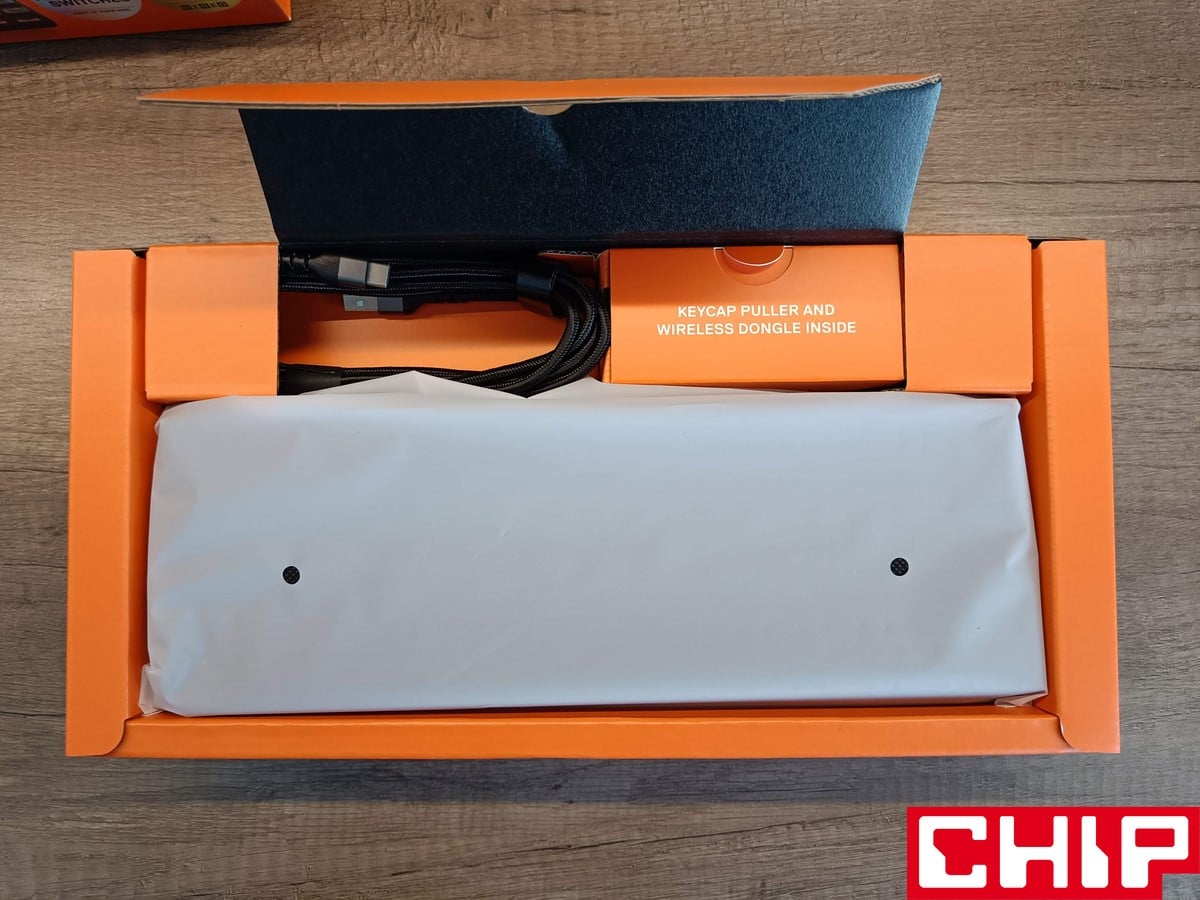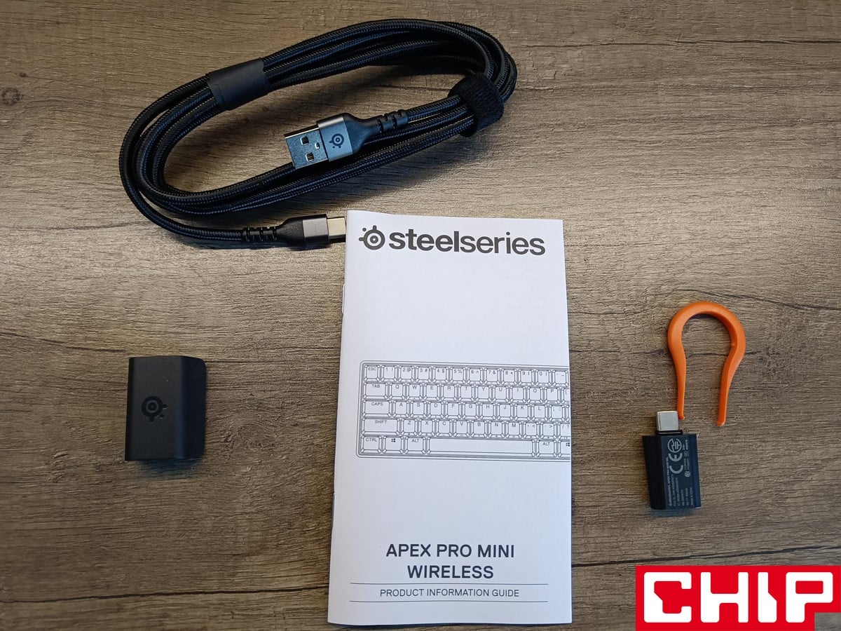Nowoczesne, tradycyjne już dla Steelseries pudełko i niezaskakujące wyposażenie. Tak oto w skrócie można opisać początek naszej przygody z klawiaturą Apex Pro Mini Wireless, w zestawie z którą otrzymujemy kartę informacyjną, odpinany przewód USB-A do USB-C wysokiej jakości ze srebrnymi wstawkami sygnowanymi logo producenta, ściągacz do klawiszy, odbiornik na USB-C i adapter USB-C do USB-A z gumową podstawką.