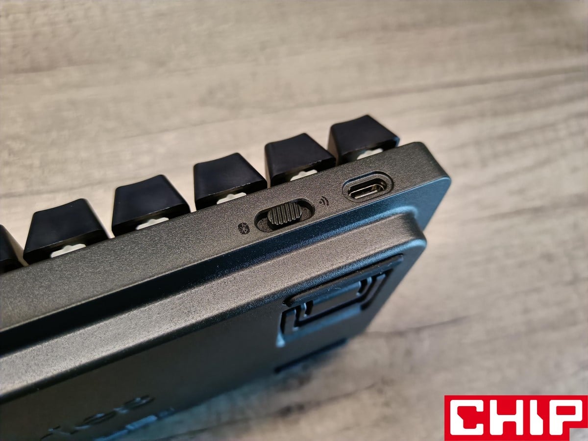 Poza tym, ta propozycja Steelseries, mimo że nastawiona na mobilność, doczekała się wyprofilowanej, bo ustawionej pod kątem podstawy, która ułatwia pisanie. Cechy szczególne? Tych jest niewiele, bo poza wspomnianymi nóżkami oraz przyciskami, Apex Pro Mini Wireless otrzymał też port USB-C do ładowania i trybu bezprzewodowego oraz przełącznik wybierający między trybem radiowym 2,4 GHz, przewodowym i Bluetooth. Tryby bezprzewodowe funkcjonują dzięki wbudowanemu akumulatorowi o wytrzymałości do 30 (USB 2,4 GHz) lub 40 godzin (Bluetooth) z podstawowym podświetleniem.