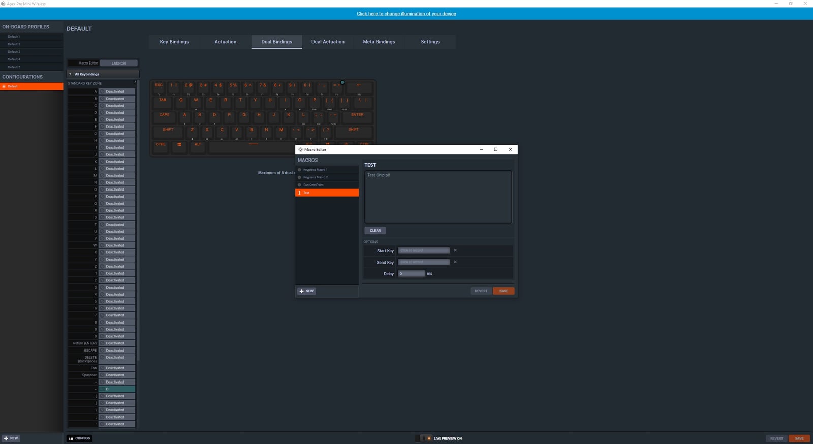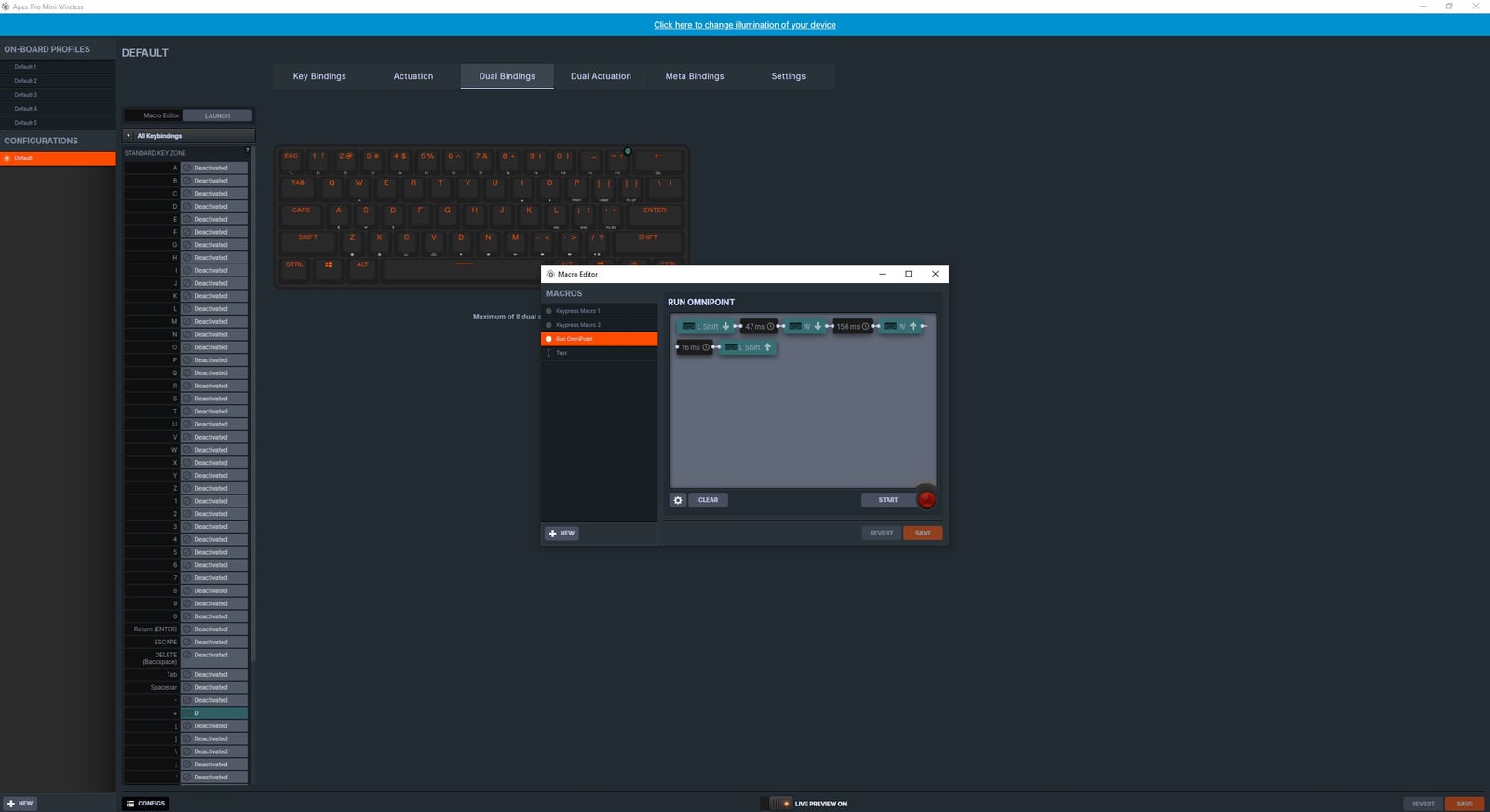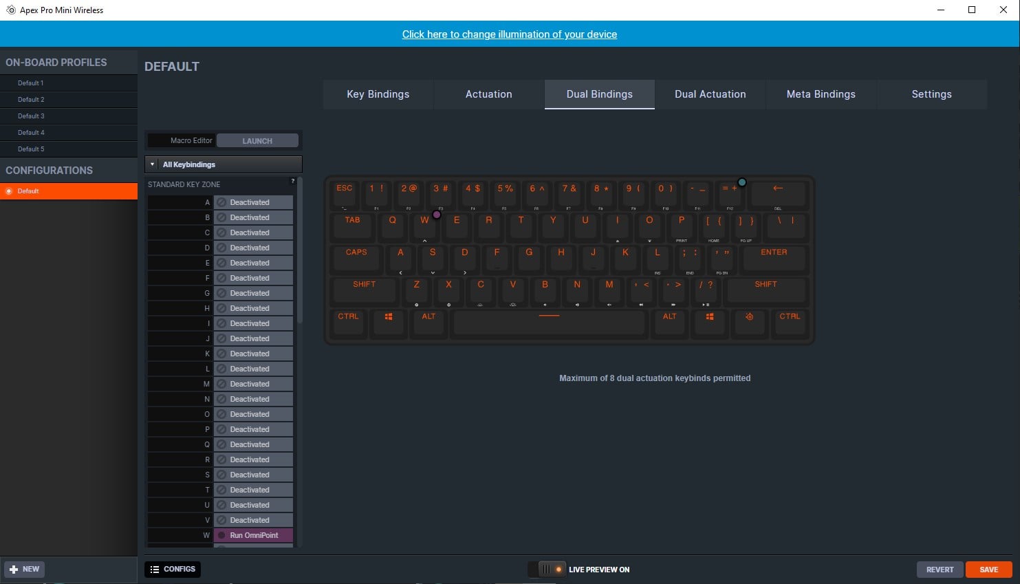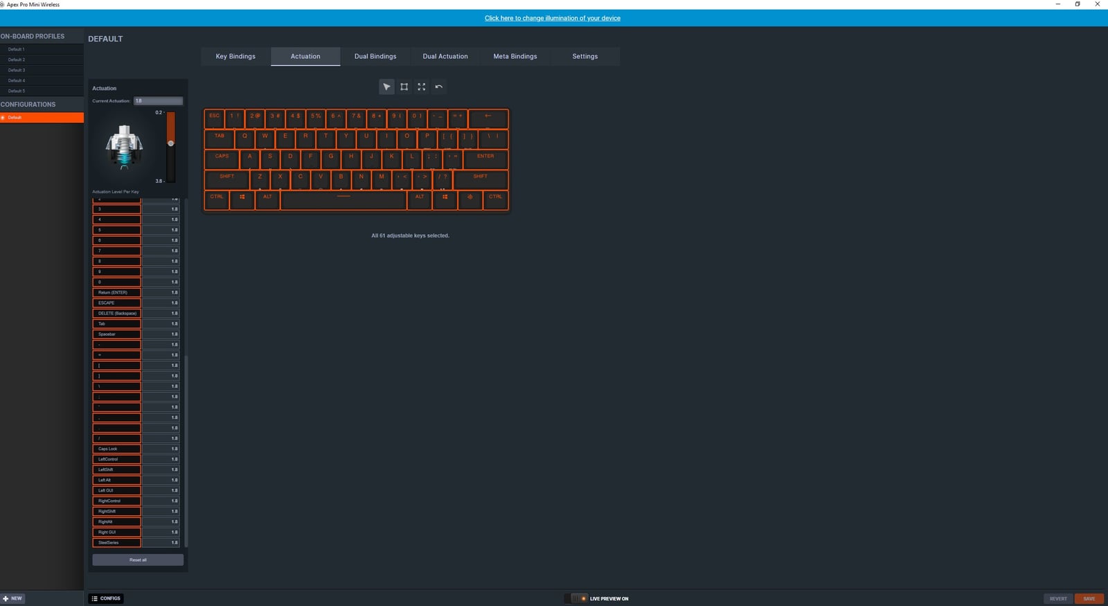 Jak możecie się domyślić, możliwość ustawienia czy przycisk ma aktywować się przy delikatnym nacisku, czy głębokim wcisku, to coś wyjątkowego na całym rynku przełączników mechanicznych. Dzięki temu możemy nawet(!) zapisać dwie funkcje dla danego przełącznika, zależnie od tego, czy wciskamy klawisz lekko, czy głęboko. W efekcie można nadać Apex Pro Mini Wireless charakter gałki w kontrolerach, ustawiając chód postaci na delikatnie wciśnięty przełącznik i sprint na wciśnięty do końca (zależnie od gry, wymaga to różnego podejścia – makra shift+alt lub po prostu dedykowanego przycisku).