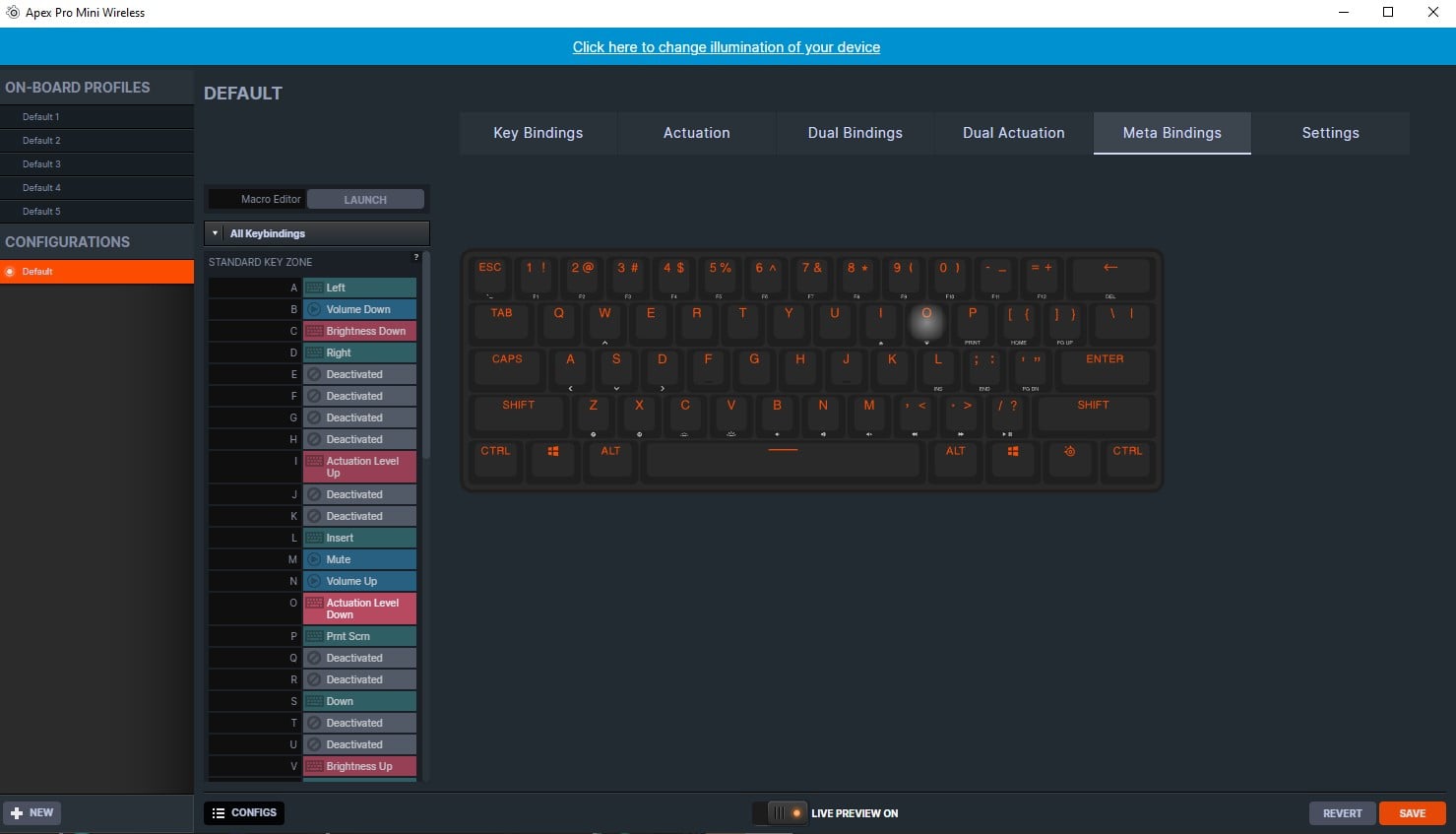 Najważniejsze menu sprowadzają się oczywiście zarówno do ustawiania poziomu aktywacji przełącznika, jak i przypisywaniu drugiej funkcji do właśnie drugiego (wcześniej ustawionego) poziomu wciśnięcia. Niestety nie udało mi się uzyskać dostępu do sektora z zarządzaniem podświetleniem (wedle zapowiedzi to jest bardzo rozbudowane), ale to i tak możemy zmieniać z poziomu samej klawiatury (konkretnej kombinacji). To jednak zapewne kwestia dopracowania oprogramowania. Poza tym Steelseries pozwala nam zapisywać do 5 profili w pamięci urządzenia i tworzyć nieograniczoną liczbę konfiguracji.