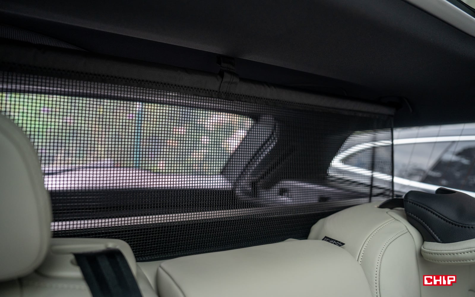 Z tyłu mamy też elegancko wysuwane uchwyty na napoje z krawędzi otwieranego podłokietnika. Po jego otwarciu mamy też dostęp do bagażnika. Gdybyśmy chcieli przewozić coś długiego. Plus jest też za nawiewy klimatyzacji na kolumnach bocznych, zamiast na środkowym tunelu. To wygodne rozwiązanie. Szyby z tyłu mogą być zasłaniane roletami, która w razie potrzeby można łatwo zwinąć. Mam wrażenie, że lekko ograniczają widoczność. A kończąc z tylną kanapą, zagłówki można wygodnie złożyć, wybierając stosowną opcję na ekranie głównym.