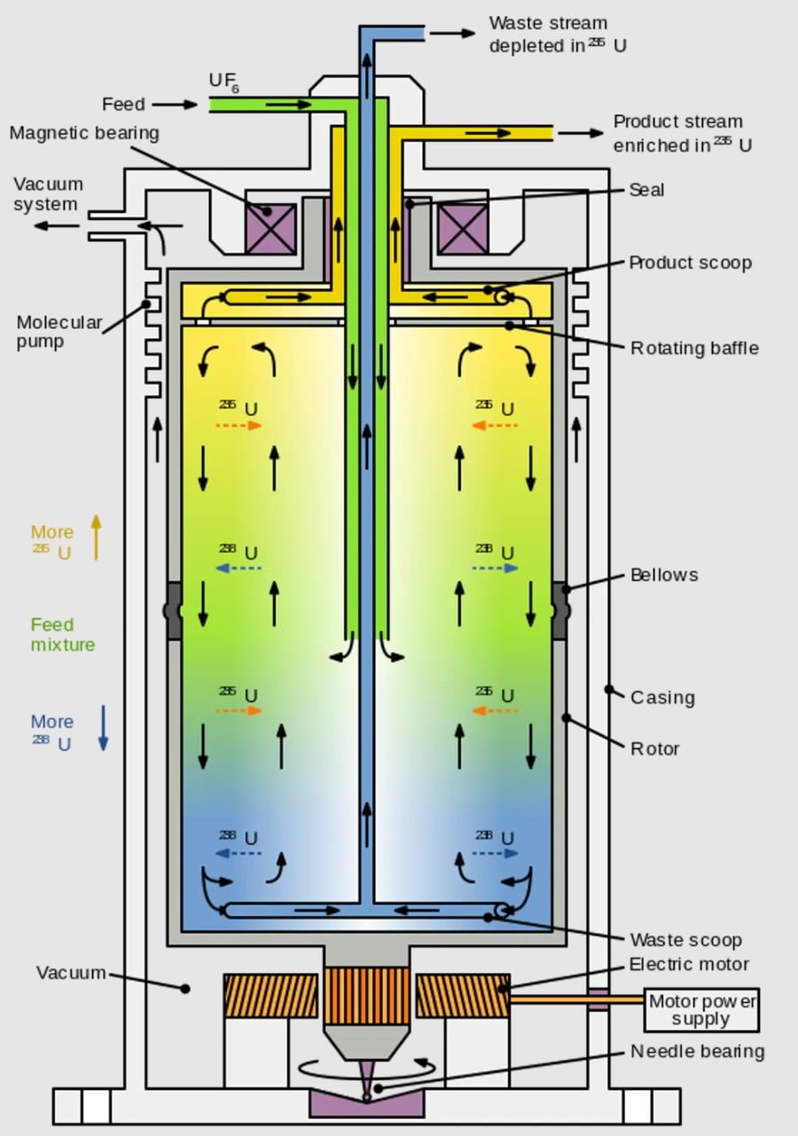Wzbogacanie uranu polega na wydzielaniu i zwiększaniu stężenia izotopu urany-235, bo to właśnie on może być wykorzystywany do wytwarzania energii jądrowej w elektrowniach lub produkcji “niszczyciela światów”. Dla przypomnienia, naturalnie występujący uran zawiera dwa główne izotopy lub formy, których atomy zawierają tę samą liczbę protonów, ale różne liczby neutronów. Jest to około 99,3% uranu-238 i 0,7% uranu-235, a proces wzbogacania jest w stanie zwiększyć zawartość uranu-235 do poziomów ponad 90%, choć już 5% wystarcza, aby wykorzystywać go w elektrowniach.