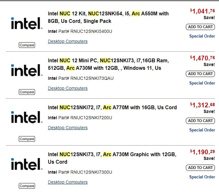 W Provantage ciągle można znaleźć cztery oferty na NUC 12. generacji Intela. Te będą wyjątkowe, bo jako pierwsze wykorzystają karty graficzne Intela, a nie firm trzecich (NVIDIA). Patrząc na poniższe oferty, których cena waha się od 1041 do 1470 dolarów, kwestia pamięci RAM i masowej wynosi kolejno 16 i 512 GB, ale pewne jest, że to tylko jedna z wielu konfiguracji, jakie będą możliwe.