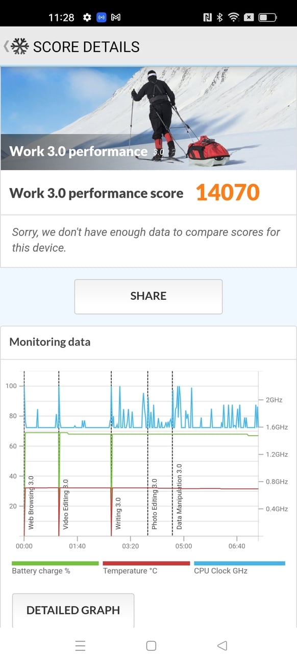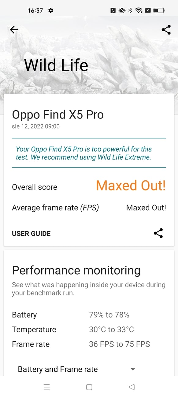 Niestety, podczas pracy z wymagającymi grami i aplikacjami smartfon dość mocno się nagrzewał. Do tego stopnia, że nie przechodzi stres testu 3D Mark Wild Life Extreme, który na ColorOS 12 kończył. Co prawda z dużym spadkiem wydajności i wysoką temperaturą, ale jednak kończył. Teraz „wywala” aplikację na 13 z 20 pętli. Oczywiście z powodu nadmiernej temperatury. Mam nadzieję, że zostanie to poprawione w finalnej wersji.