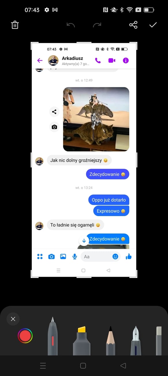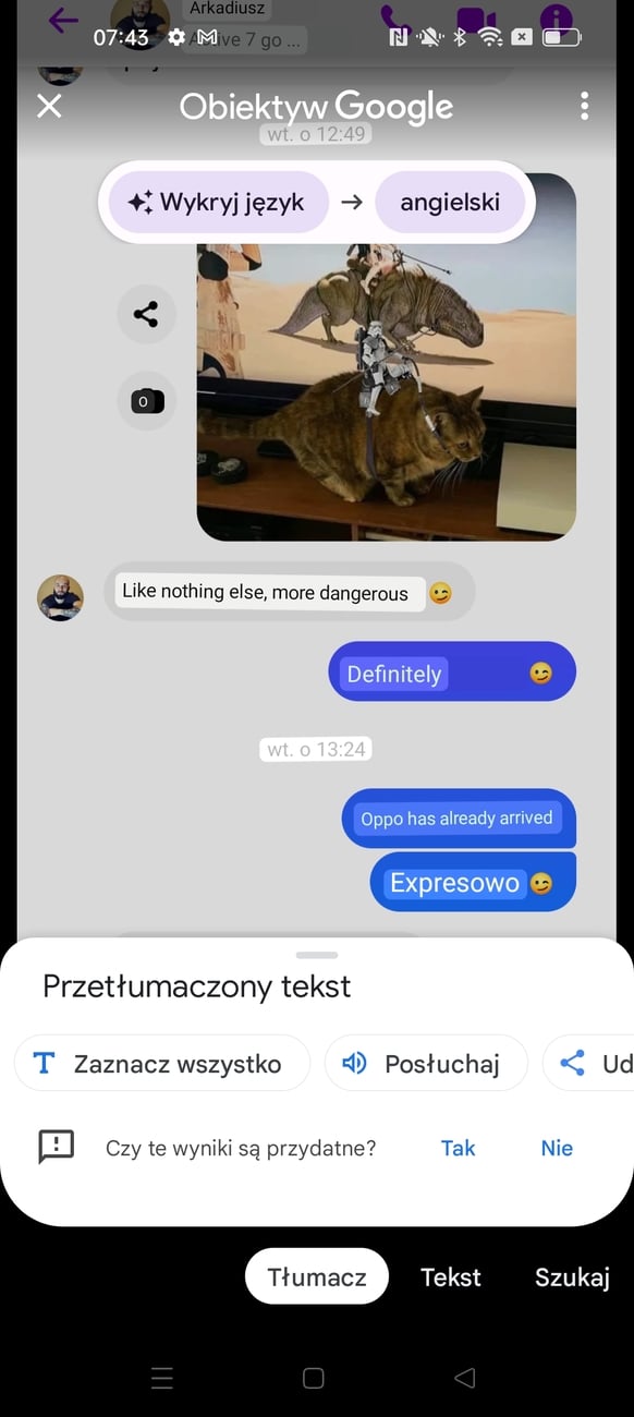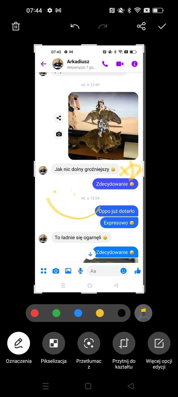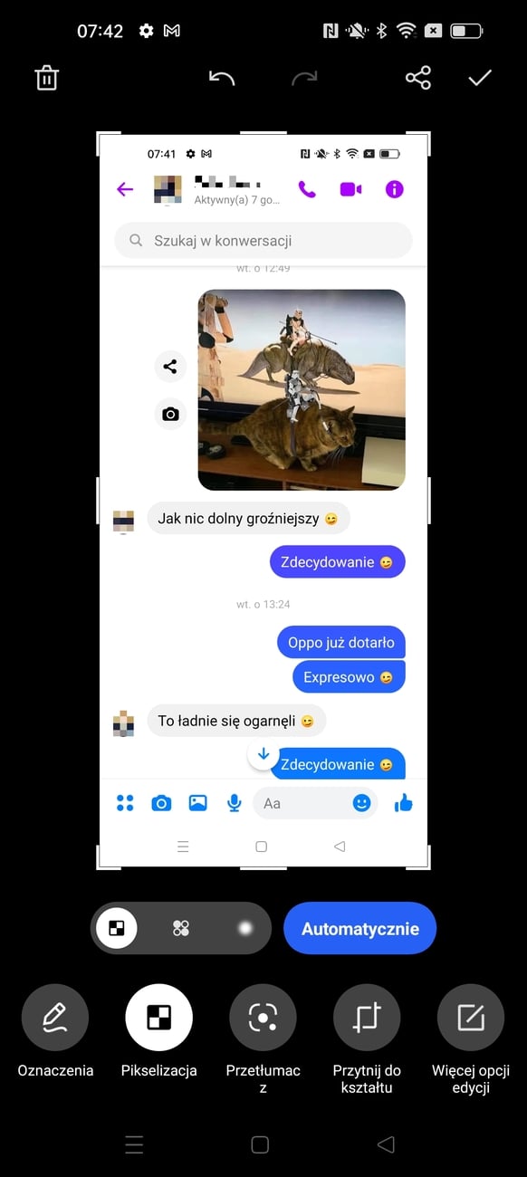 - W kwestii bezpieczeństwa witamy na pokładzie funkcję Auto Pixelate. Potrafi ona automatycznie rozpoznać i zamazać zdjęcia profilowe, awatary i nazwy użytkownika na zrzutach ekranu czatów w oparciu o opracowany przez OPPO algorytm. Bardzo ciekawa funkcja – mi się najbardziej podoba ze wszystkich nowości. Ponadto, z tego samego poziomu możemy tłumaczyć treść screenów na inne języki oraz zaznaczać dowolne fragmenty.