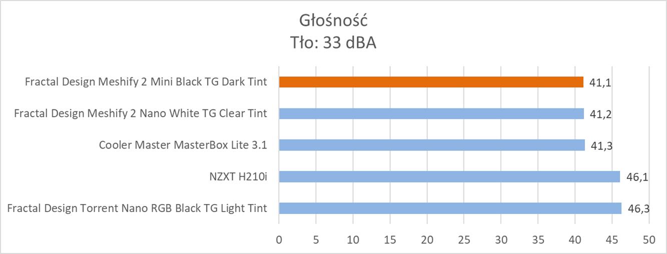 Temperatury nie są może najniższe w zestawieniu, ale na pewno są dobre. Obudowa przegrywa z Torrent Nano pod względem temperatury procesora, sekcji czy dysku ale nadal nie są to złe wyniki. Tutaj również lepiej wypada NZXT H210i, ale obudowa ma jeden wentylator z tyłu i jeden na górze, dlatego sekcja i CPU mają lepsze wyniki. Warto zwrócić uwagę na temperaturę karty graficznej, która jest akurat najniższe ze wszystkich testowanych obudów i jest ogromna różnica w stosunku do H210i. Wyniki są więc dobre i podzespoły na pewno nie będą się “dusiły”.