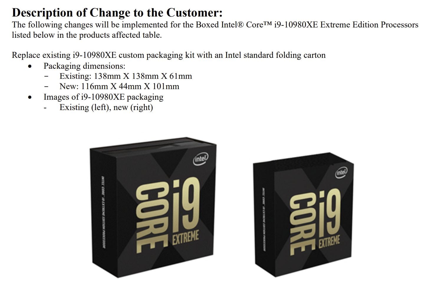 Zmiana jest największa w pierwszym przypadku, bo Intel porzucił pudełko z plastikowym “waflem krzemowym”, w którym znajdował się procesor na rzecz zwyczajnego kartoniku. W drugim z kolei postarał się wyłącznie o zmniejszenie rozmiarów i to znaczne, bo z 138 × 138 × 61 mm do 116 × 44 × 101 mm, co tyczy się też tego pierwszego.