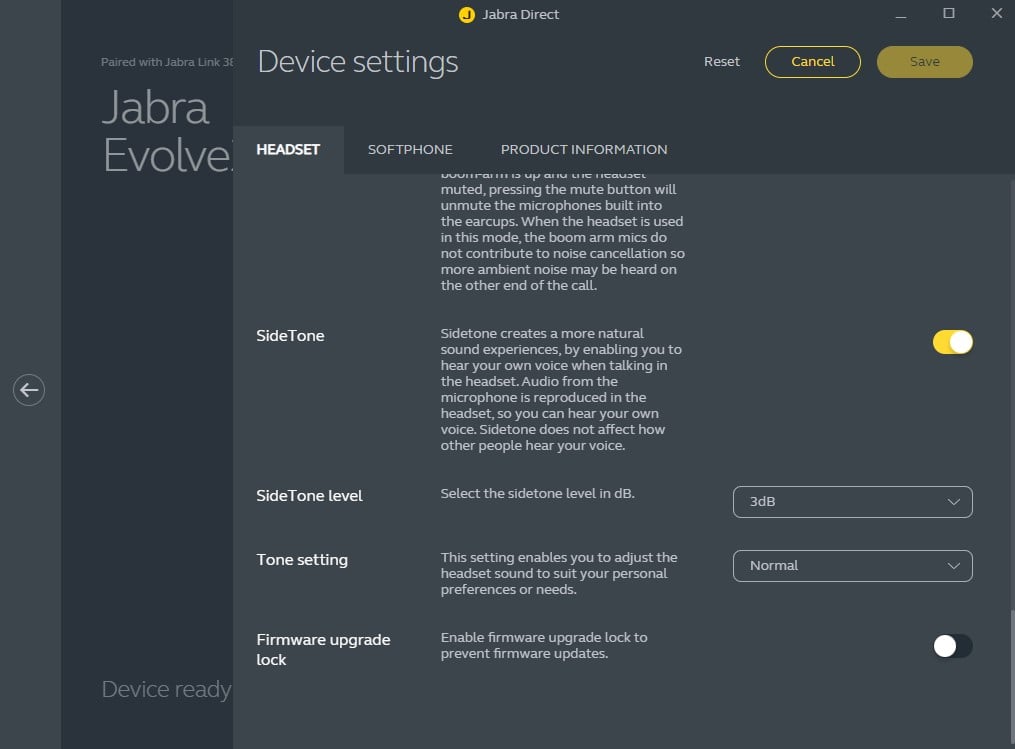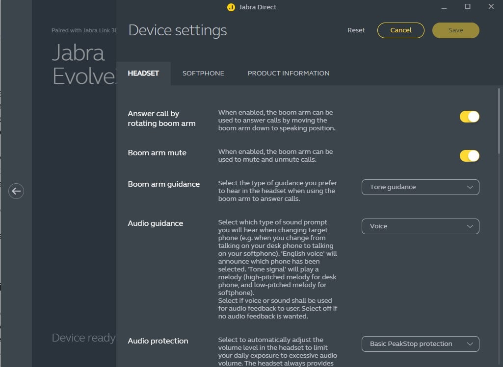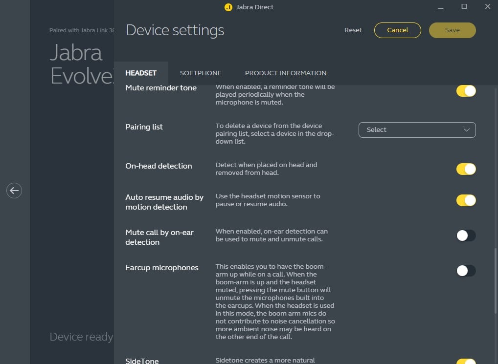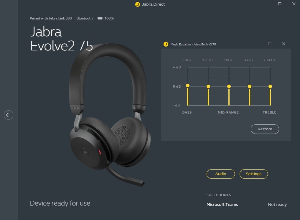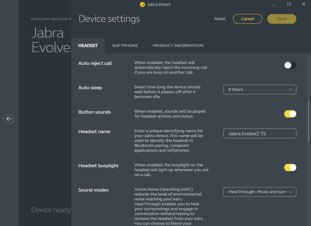 Dzięki możliwości podłączenia słuchawek do smartfona i komputera, otrzymujemy dostęp do łącznie dwóch aplikacji – Sound+ oraz Jabra Direct, które zapewniają nam możliwość zarządzania praktycznie każdym szczegółem słuchawek. Tyczy się to przede wszystkim tego, jak zestaw reaguje na poszczególne stany i jak dostosowywania konkretnych funkcji pokroju wykrywania Jabra Evolve 2 75 na naszej głowie.