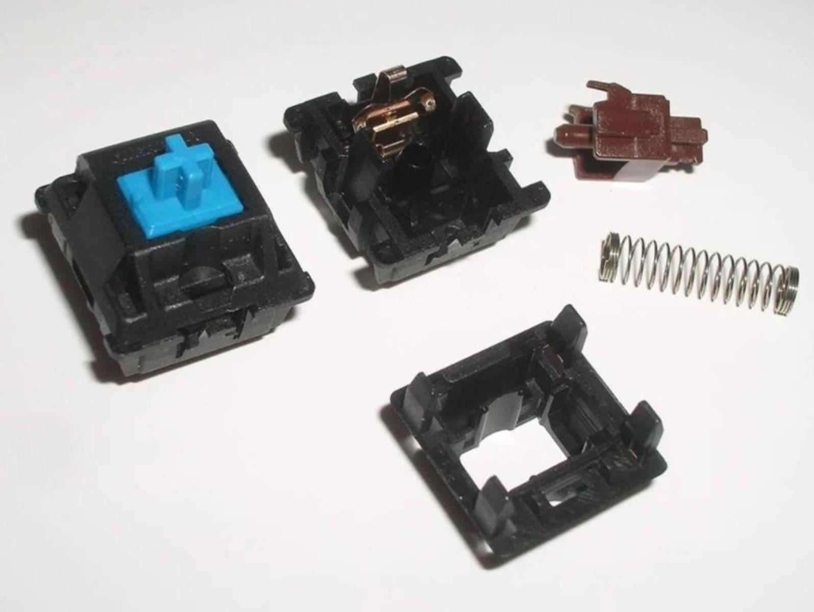 Jak już wspomniałem, z wyglądu przełączniki optyczne i mechaniczne są wręcz identyczne, ale różnią się sposobem aktywacji. Jednak nie oznacza to, że wewnątrz nich nie znajdziemy podobnych rozwiązań. W obu znajduje się oparta o trzpień sprężynka, odpowiadająca głównie za generowanie oporu i powracanie klawisza na pierwotne miejsce. To sprawia, że bez względu na rodzaj przełącznika wciskając klawisz, wciska się wewnętrzny trzpień na sprężynie, która w razie zniknięcia nacisku przywróci trzpień (więc i klawisz) do pierwotnej pozycji. Po drodze może znaleźć się dodatkowy element, który z liniowej charakterystyki zrobi taką z wyczuwalnym przeskokiem, czyli nieliniową.