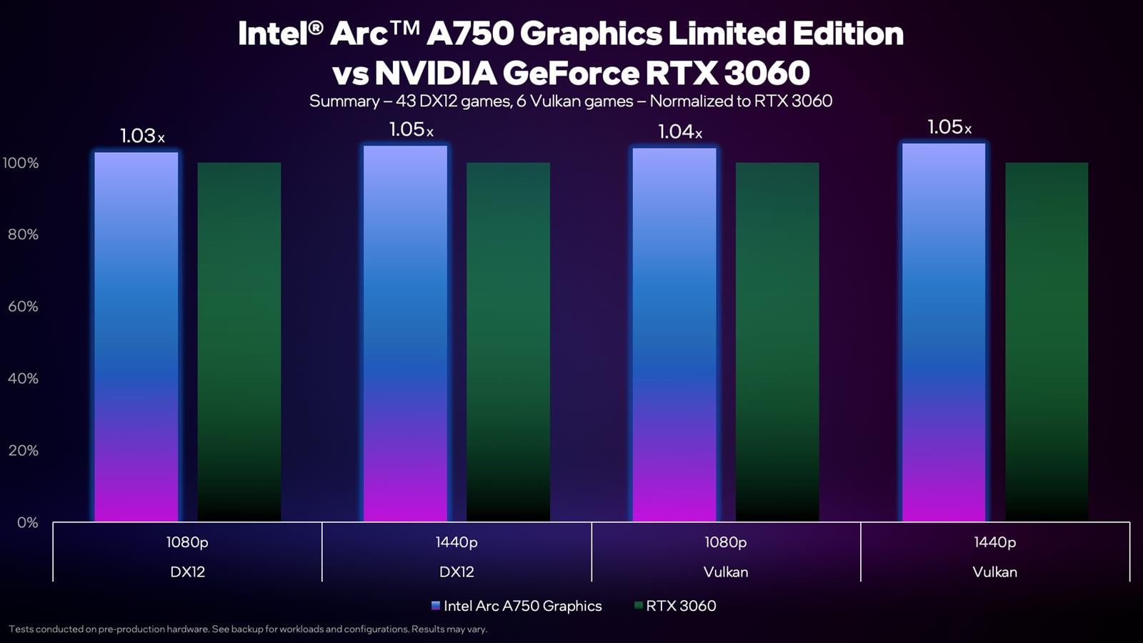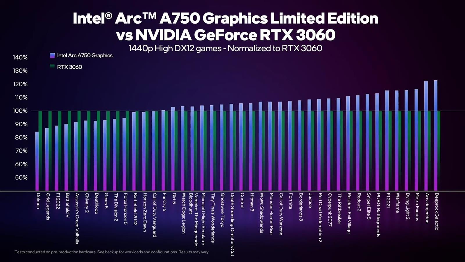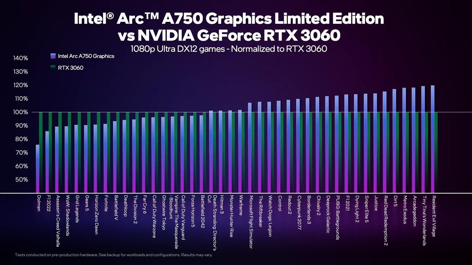Co z kolei Intel zrobił na nagraniu powyżej? Przetestował swój model Arc A750 Limited Edition w 43 grach z DirectX12 oraz 6 z API Vulkan, porównując go do RTX 3060. Obie karty zostały przetestowane na identycznych platformach, które objęły procesor Intel i9-12900K i płytę główną ASUS ROG Maximus Z690 Hero z 32 GB pamięci DDR5-4800 oraz system Windows 11 Pro. Warto wspomnieć, że tak jak wydajność RTX 3060 jest już doszlifowana przez optymalizacje, tak możliwości A750 mogą się poprawiać w czasie.