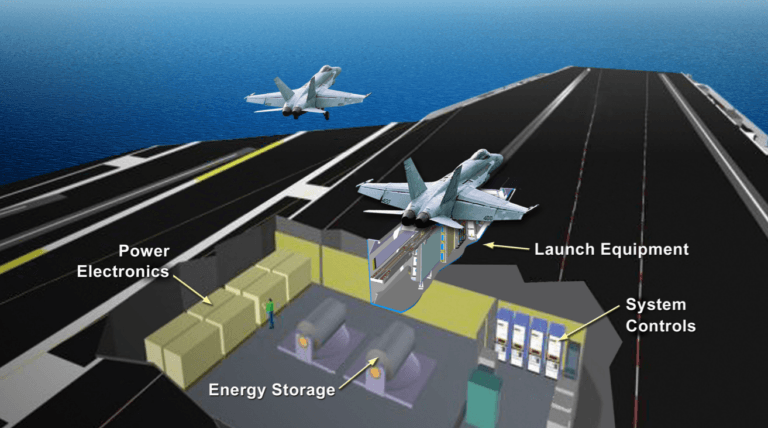 W przypadku USA za opracowanie katapulty elektromagnetycznej odpowiada koncern General Atomics, który sprowadził EMALS do specjalnie zaprojektowanych indukcyjnych silników liniowych na prąd zmienny, aluminiowego “wózka”, silnika indukcyjnego oraz systemu magazynowania energii elektrycznej. W praktyce wygląda to tak, że te pierwsze generują pole elektromagnetyczne wzdłuż długości całej katapulty, wprawiając w ruch wózek, do którego to przyczepia się myśliwiec.